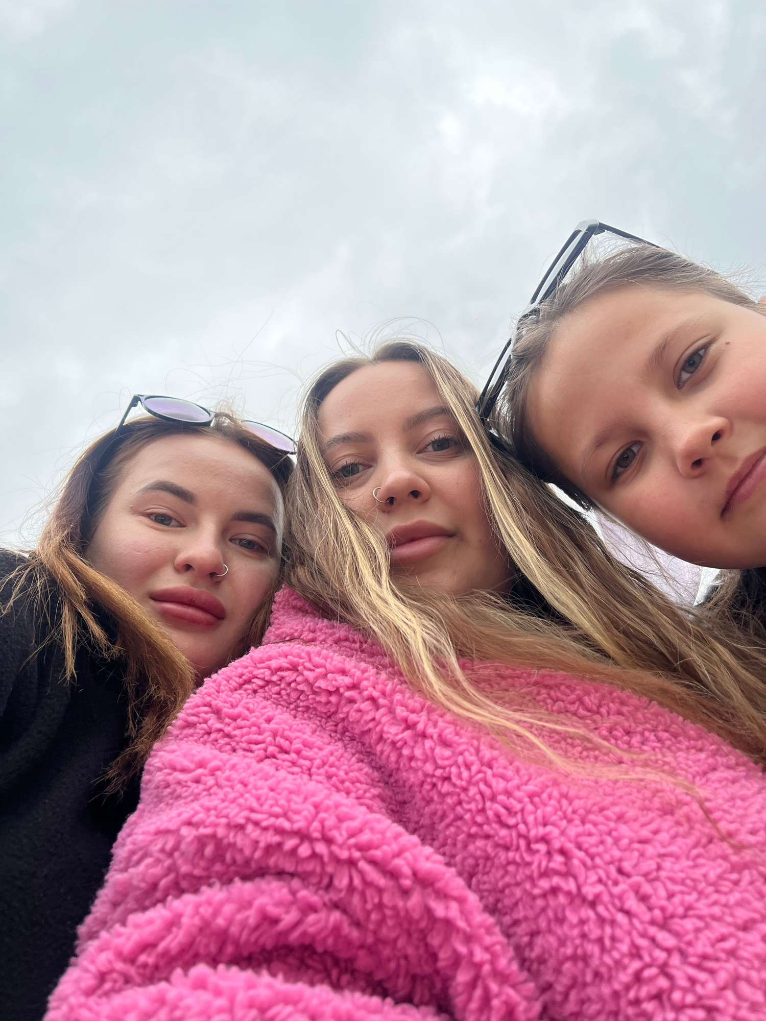 A low-angle selfie captures three young women, likely teenagers or young adults, clustered together and looking down towards the camera. The image is rotated diagonally, showing their faces from chin-…read more