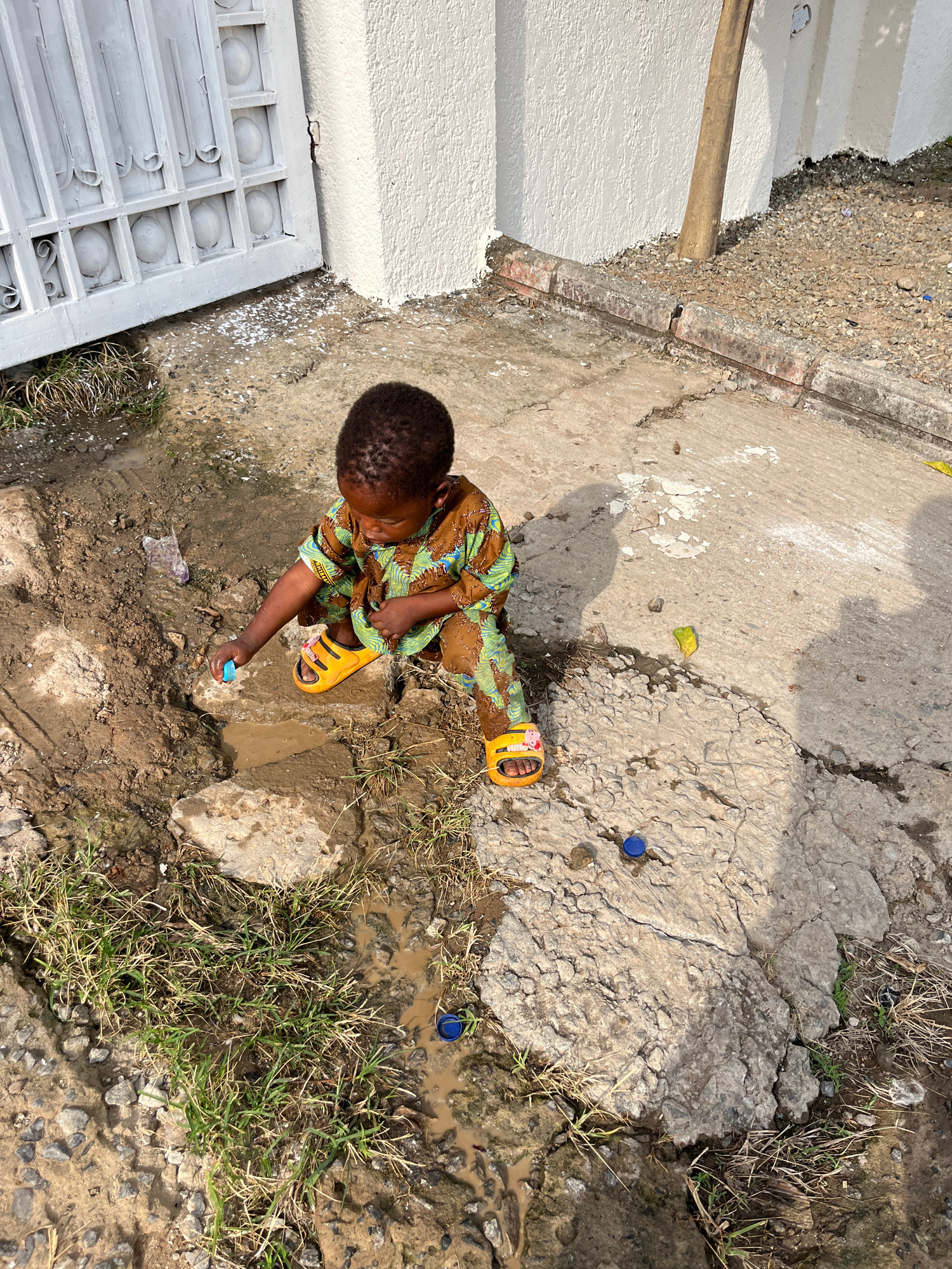 A young child, presumably a boy, is playing in a puddle of dirty water in an urban environment. The child is dark-skinned, dressed in a brown, green, and yellow patterned shirt and wearing yellow sand…read more