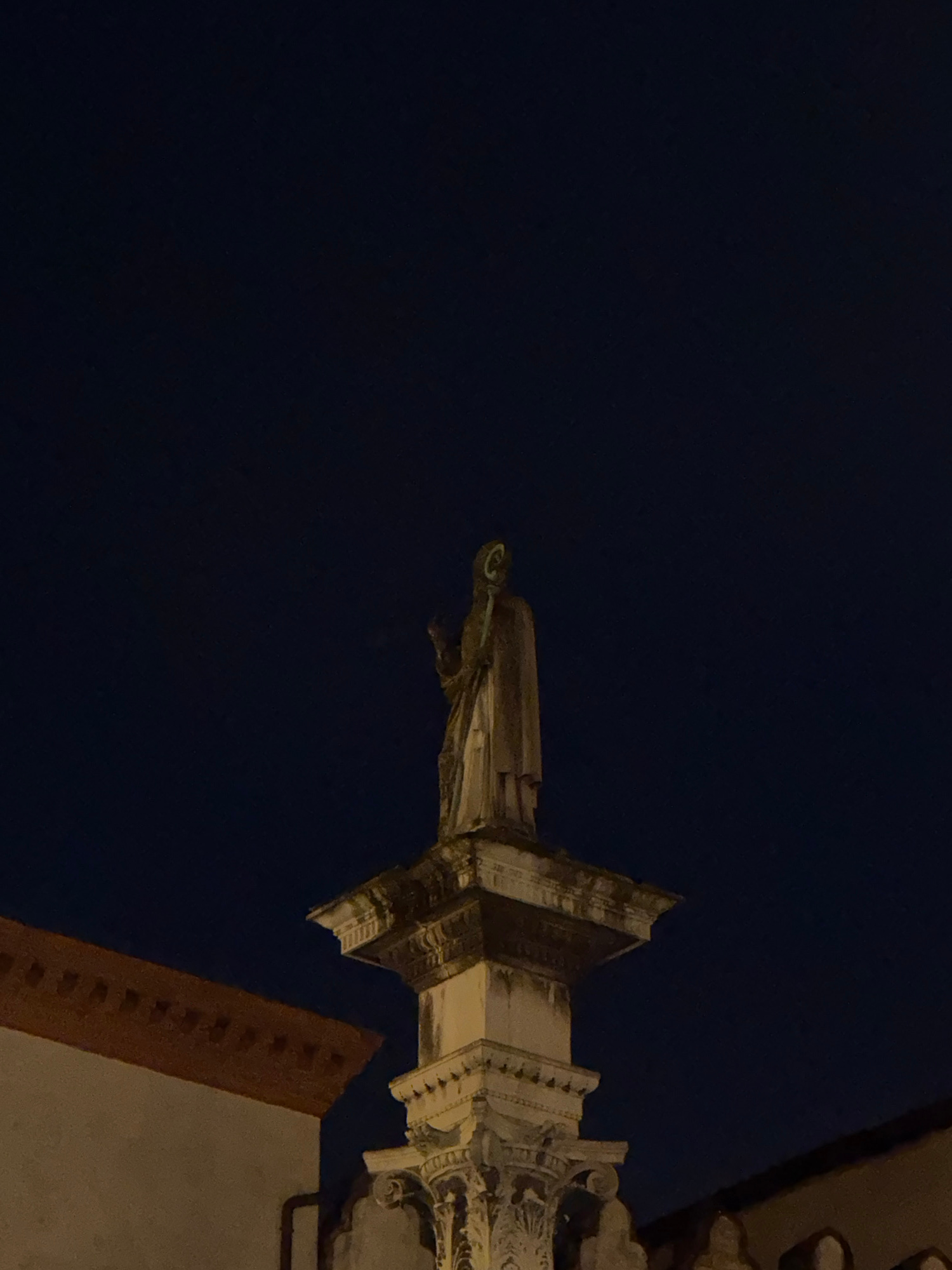 The image depicts the column of the Virgin Mary in Ravenna, Italy, at night. The column, topped with a statue of the Virgin Mary, is illuminated against a dark blue sky. Architectural details of the c…read more
