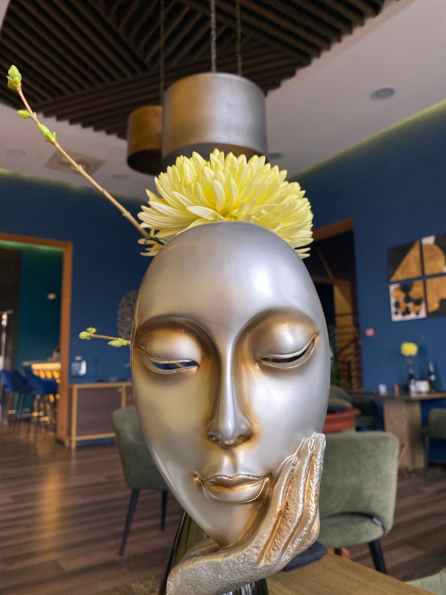 The image shows a silver-colored face sculpture with closed eyes and a yellow flower behind it. The sculpture appears to be an art piece, possibly displayed as part of an interior design. In the backg…read more