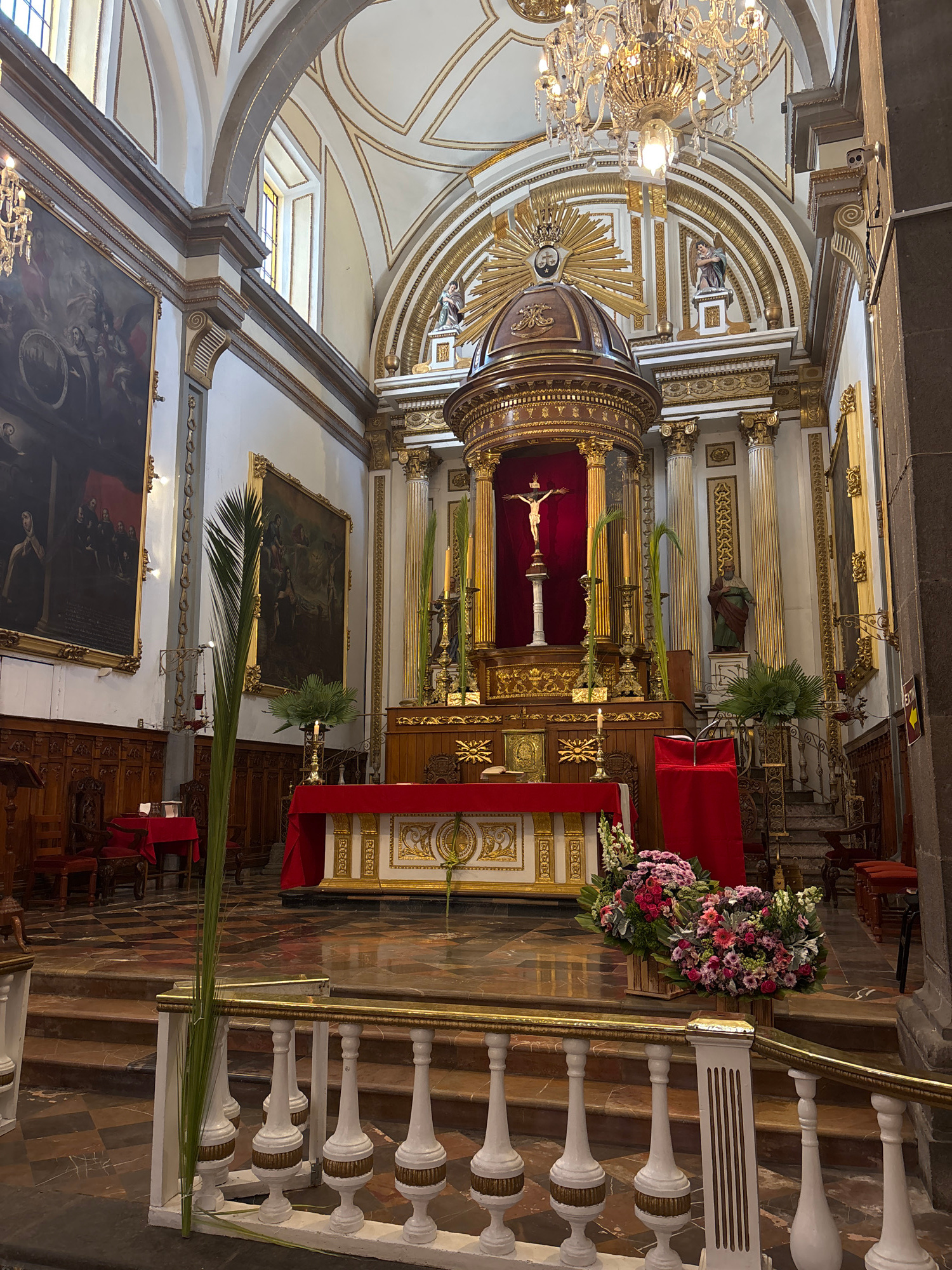 The image shows the interior of a church, presumably located in Puebla, Mexico, judging by the architectural style common in the region. The altar is prominently featured, adorned with gold accents an…read more