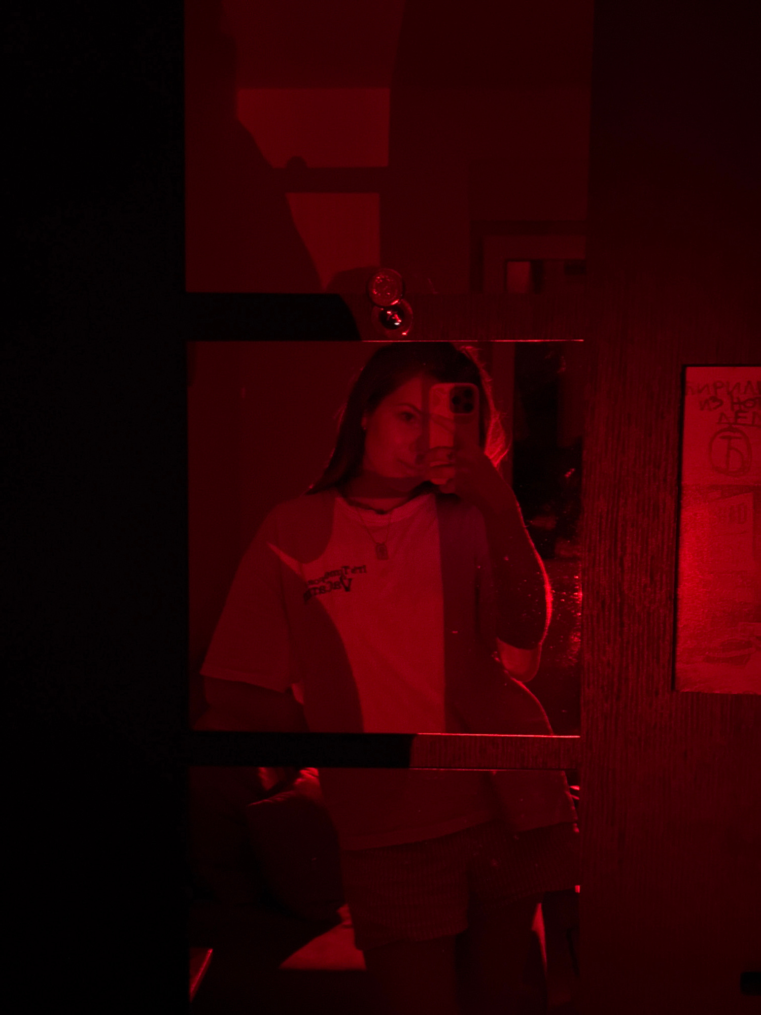The image, bathed in deep red light, captures a mirror selfie taken indoors. In the central panel, a person, likely female, holds a smartphone with a prominent multi-lens camera to capture their refle…read more