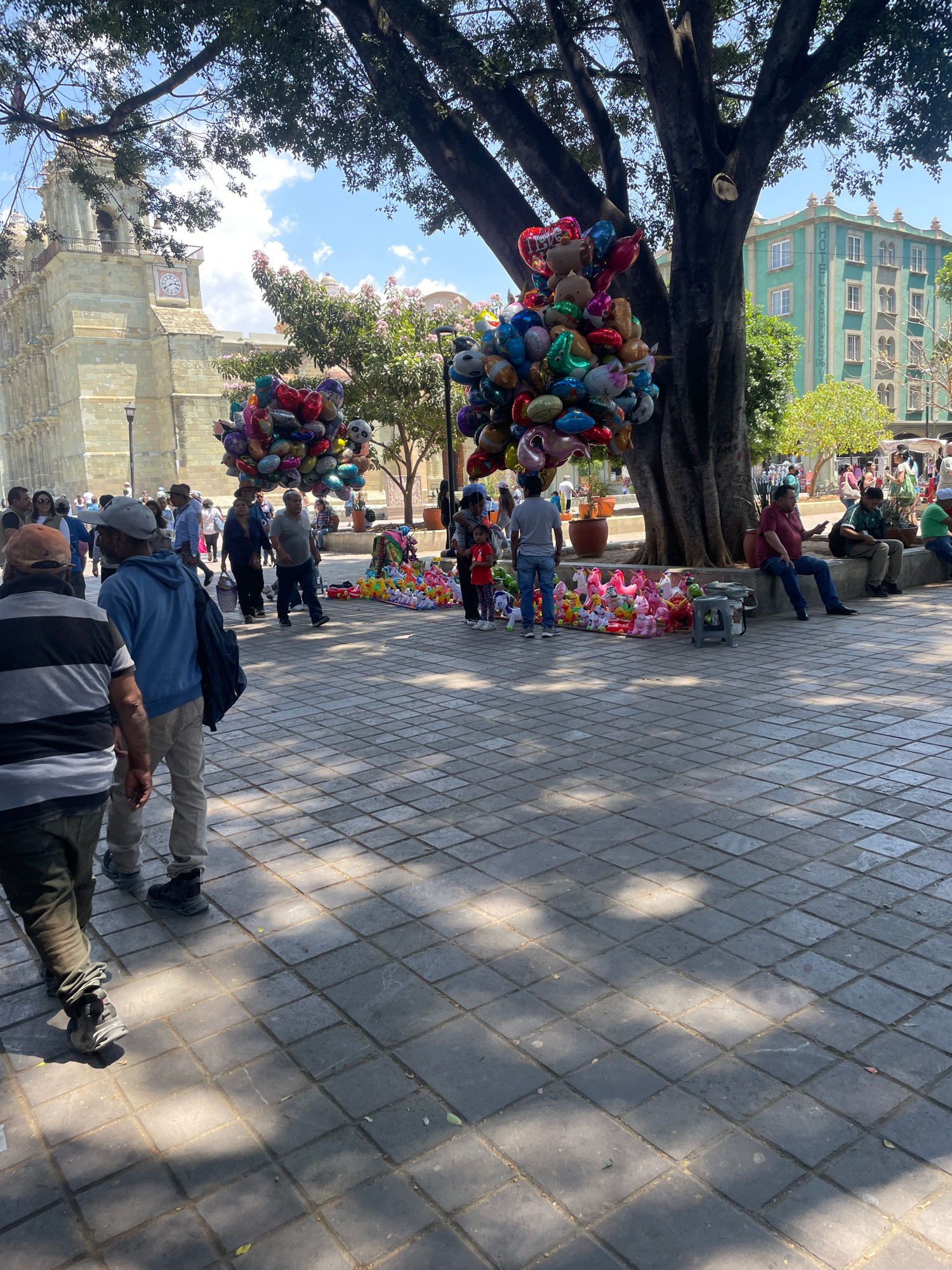 This outdoor photograph shows a street scene in Oaxaca City, Mexico. The perspective is angled to the left, with the foreground dominated by a gray, patterned brick surface. In the middle ground, num…read more