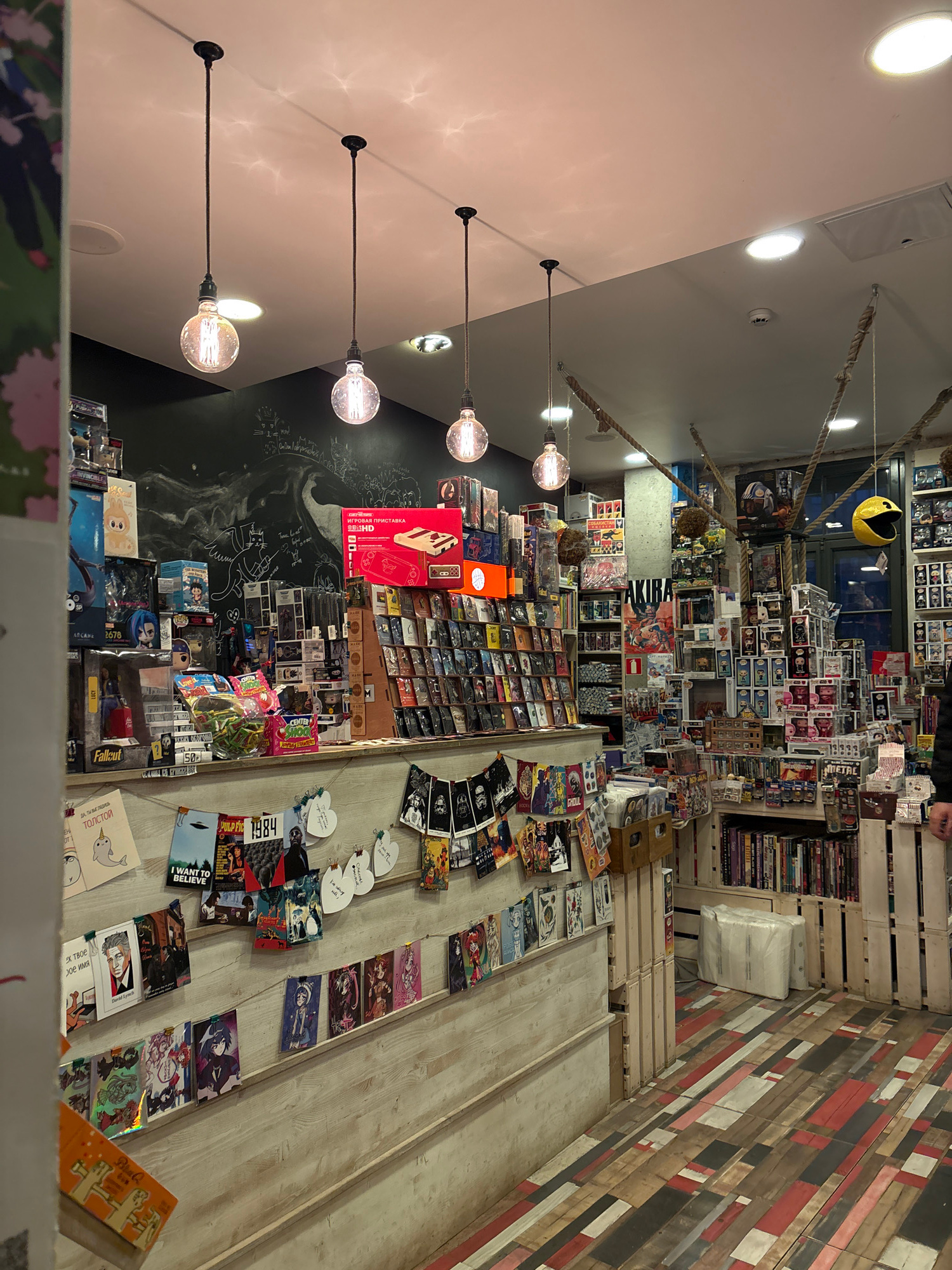This is an interior shot of a shop in Saint Petersburg, Russia, with a cluttered, maximalist aesthetic. The space is packed with merchandise and displays. On the left side of the frame are light pink…read more