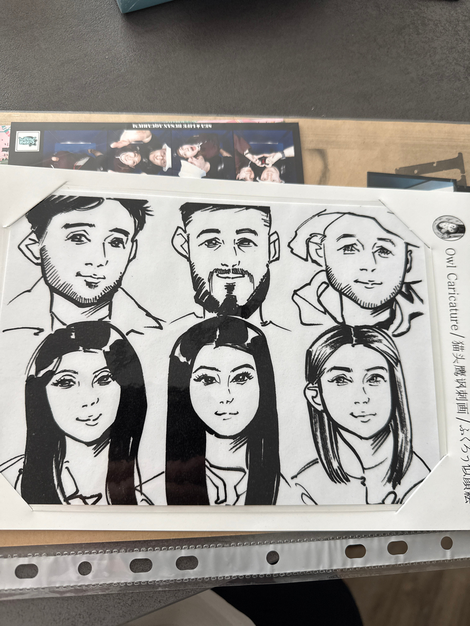The image shows a drawing labeled "Owl Caricature" in English, Chinese, and Japanese. The drawing features three pairs of portraits in a cartoonish style, likely caricatures of individuals. The top pa…read more