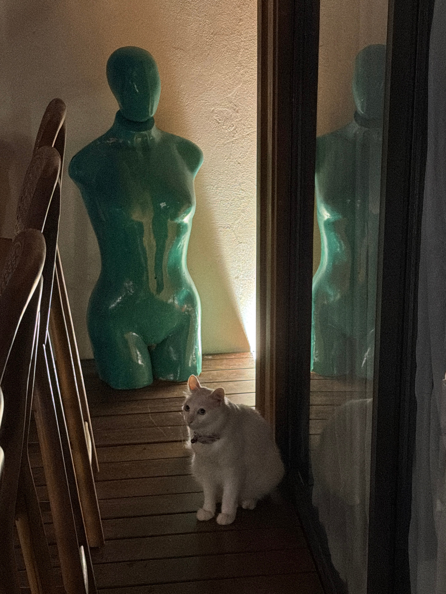 A low-angle indoor shot shows a green, mannequin torso lying sideways on a shelf, next to a white cat with a collar, its head facing the viewer. Underneath the mannequin are several wooden hangers. Th…read more