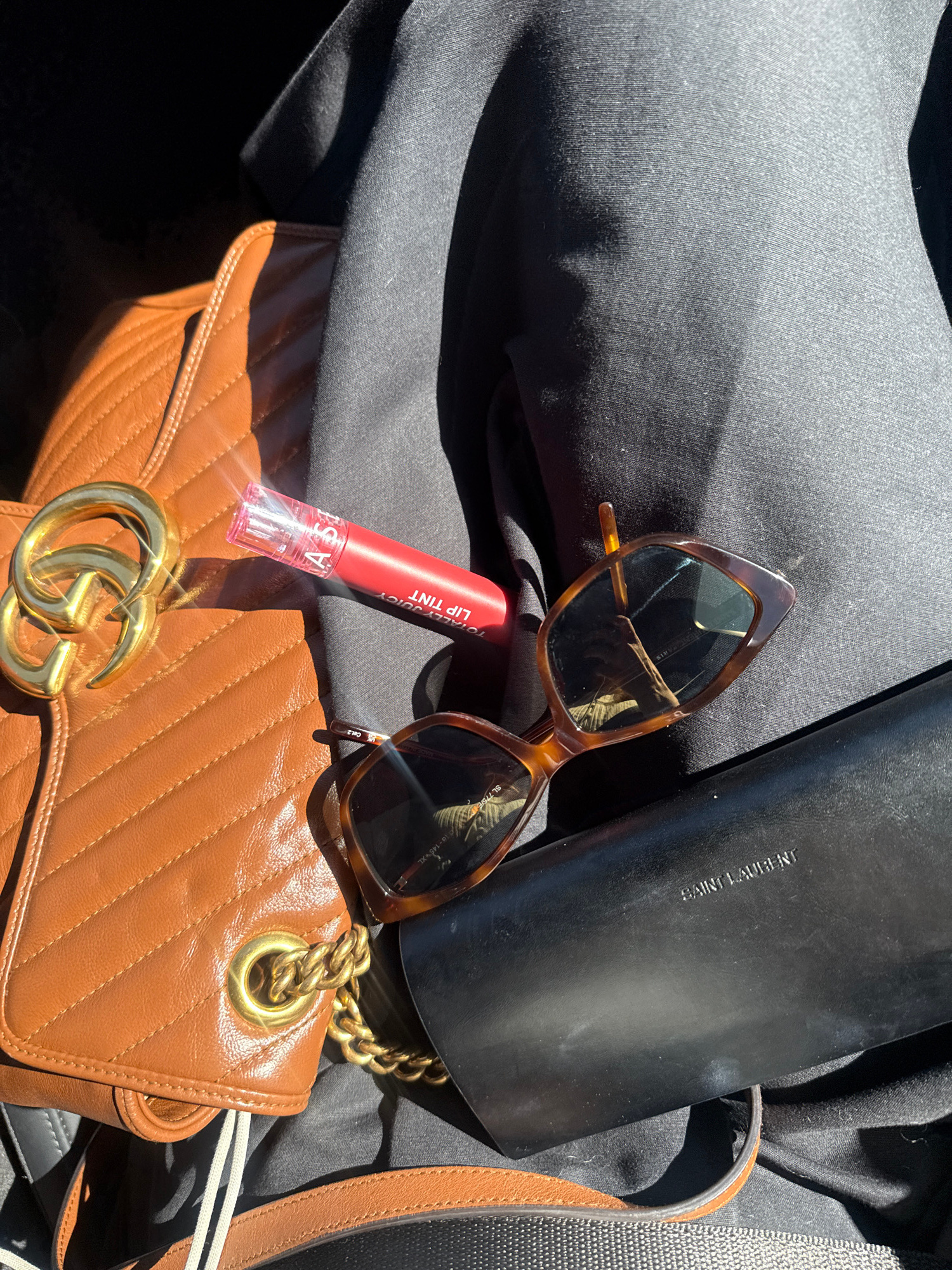 The image shows a collection of personal items: a brown Gucci Marmont handbag, a black Saint Laurent sunglasses case, brown sunglasses, and a tube of lipstick. These items are placed on a dark-colored…read more