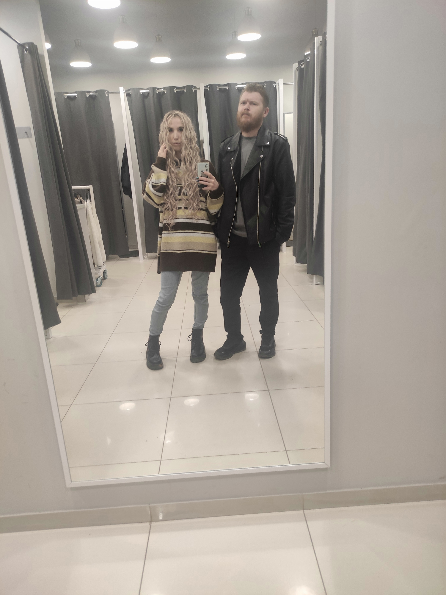 Two individuals are reflected in a large mirror located within a fitting room in Chaikovsky, Russia. The room is characterized by a bright, white-tiled floor and white walls. Grey curtains hang along…read more