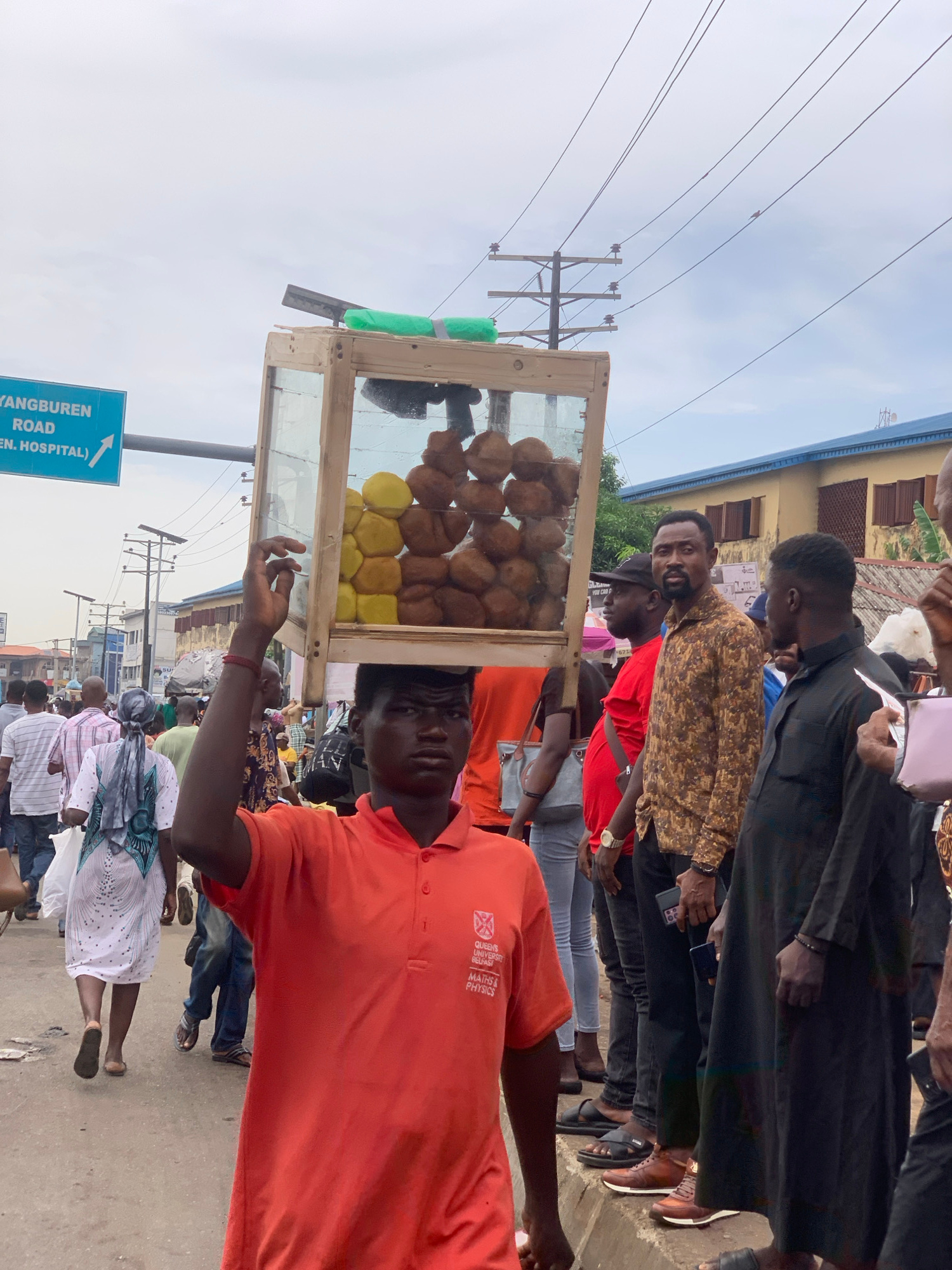 A street vendor in Ikorodu, Nigeria, stands in a crowded area, selling what appears to be fried dough. He is wearing an orange shirt bearing the logo of Queen's University Belfast, specifically the deβ¦read more