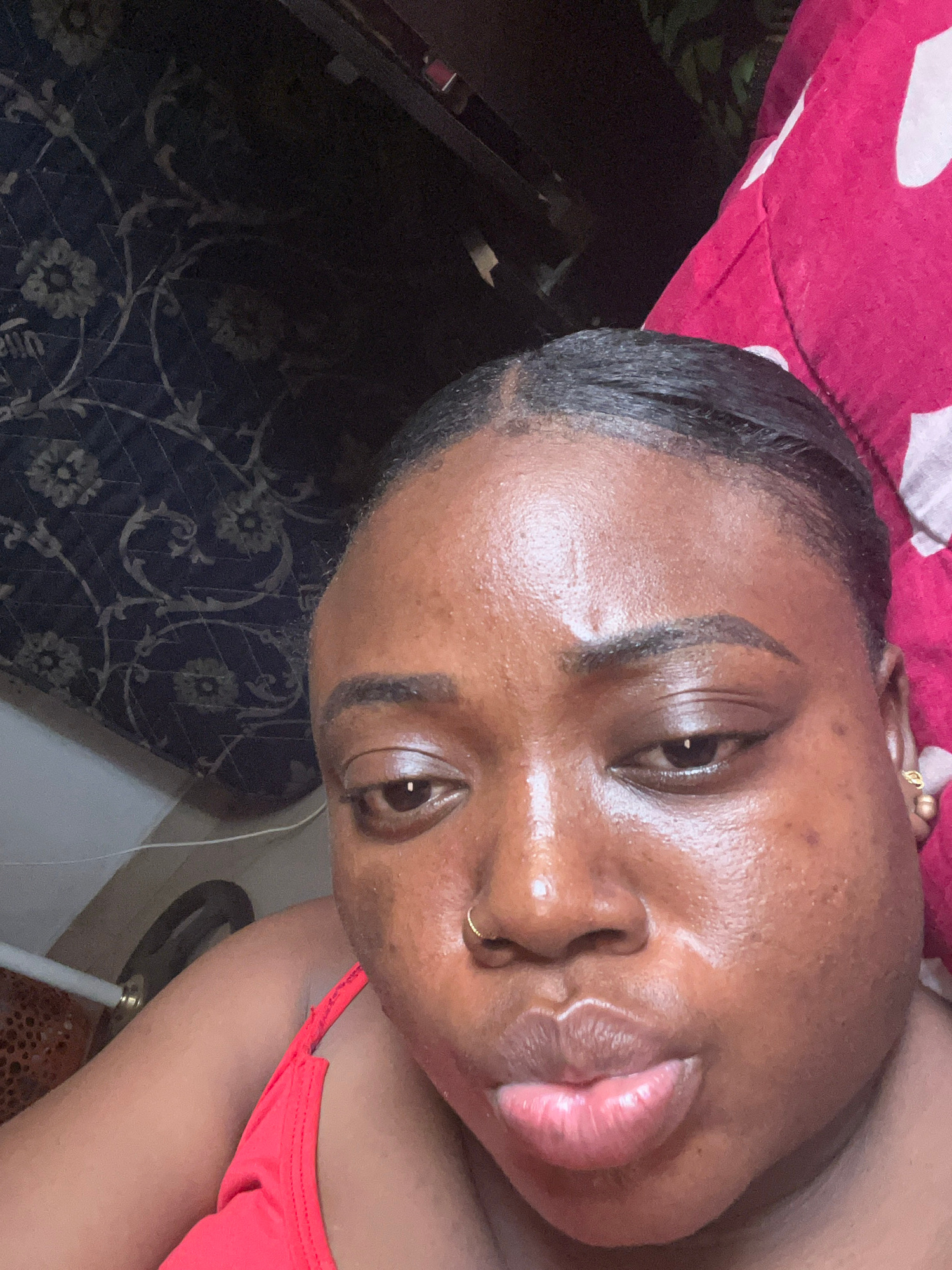 A close-up selfie of a woman with dark skin, brown eyes, and black hair is shown. She has a nose ring and earrings. She is wearing a red top. The background includes a red and white patterned surface…read more