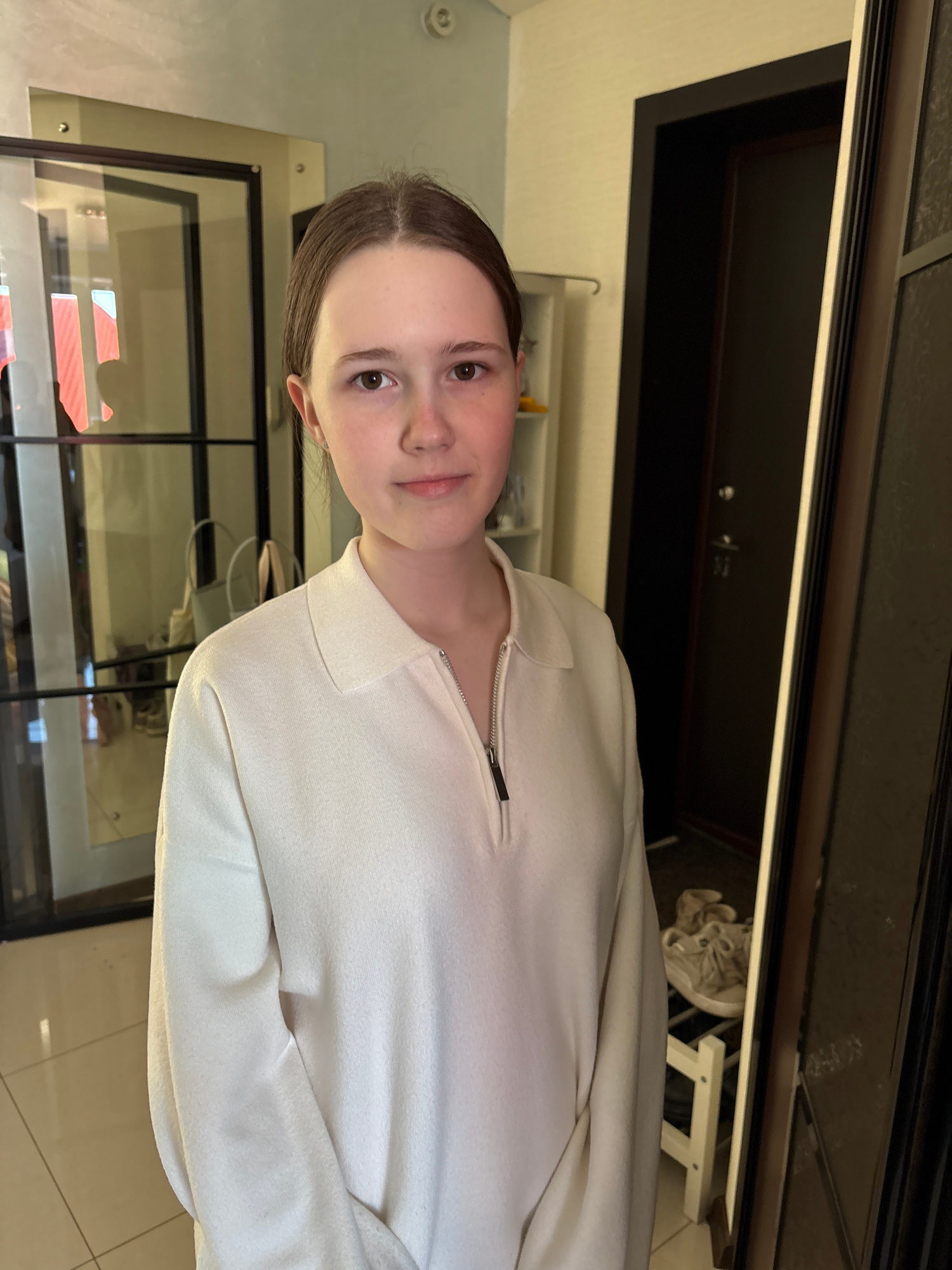 A young person with light skin and brown hair, parted in the middle, is wearing a white zip-up sweater. They are looking at the camera. The background includes a black door frame, a glass-paneled stru…read more