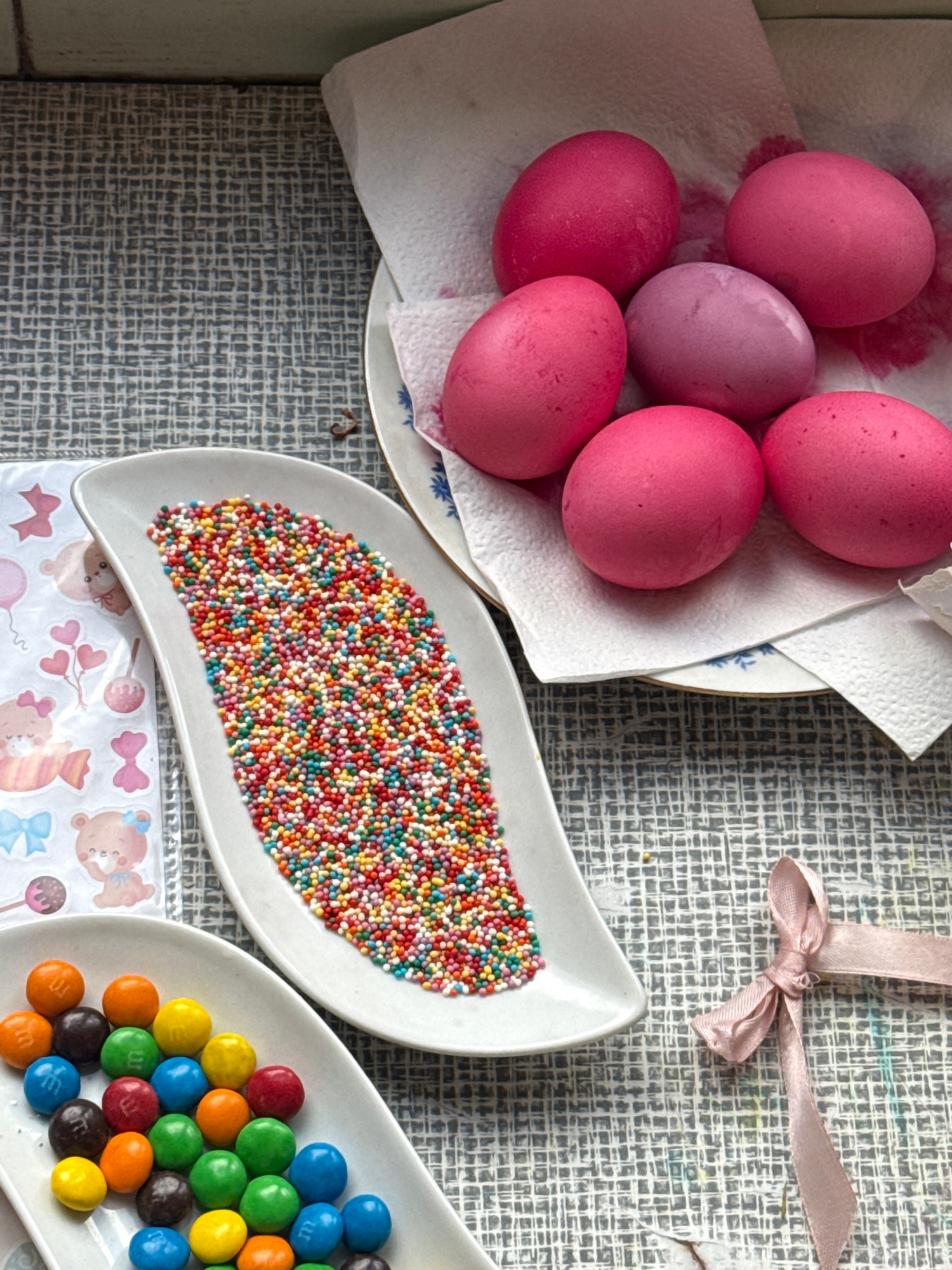 The image shows a table setting with Easter egg decorating supplies. There is a plate with six dyed eggs, mostly pink with one lavender, sitting on a paper towel. There is a white, leaf-shaped dish fi…read more