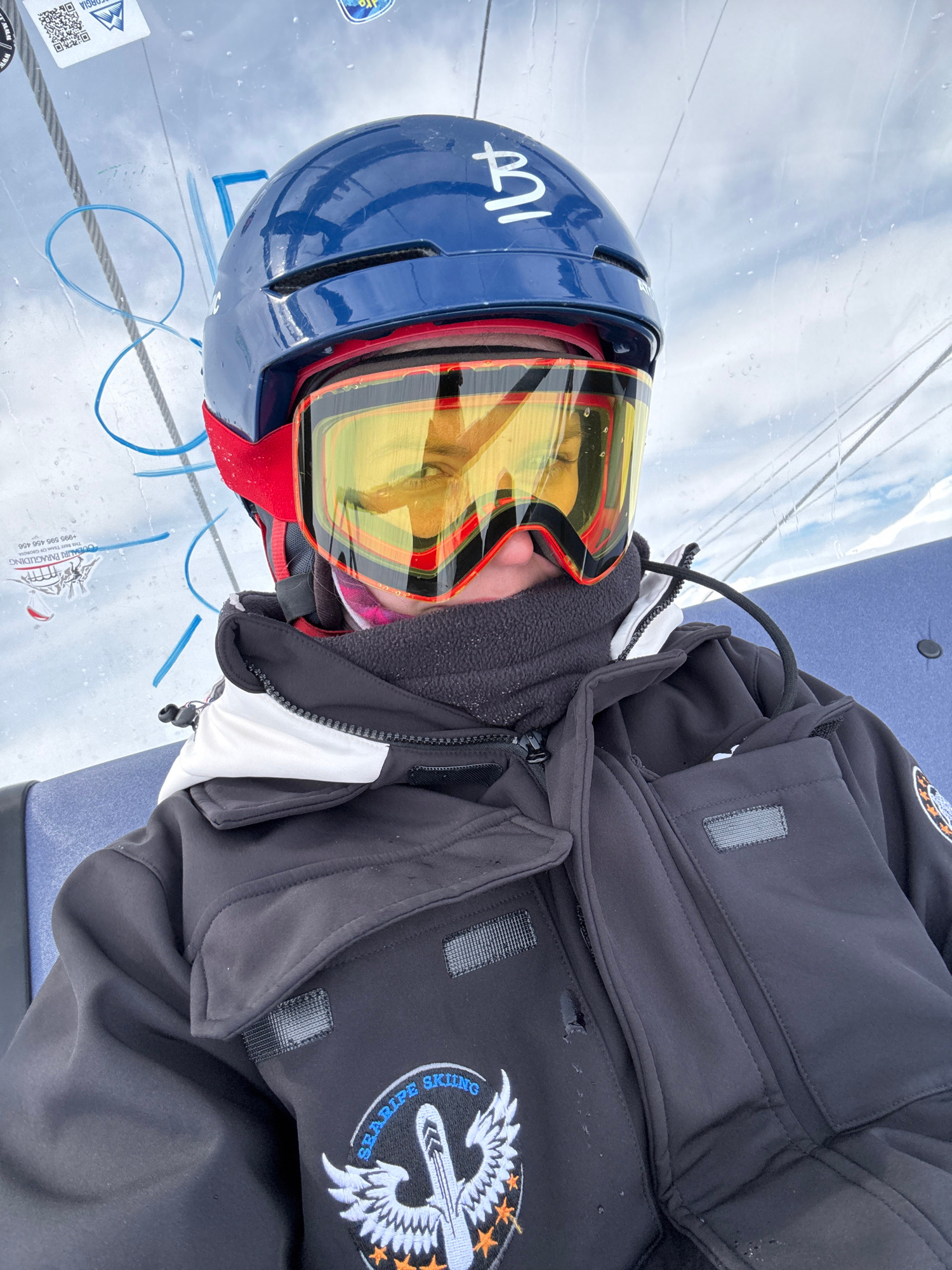 The image shows a person wearing a blue helmet with the letters "BI" written on it, along with yellow goggles. The person is also wearing a black jacket with a patch that reads "SEARIPE SKIING" alongβ¦read more