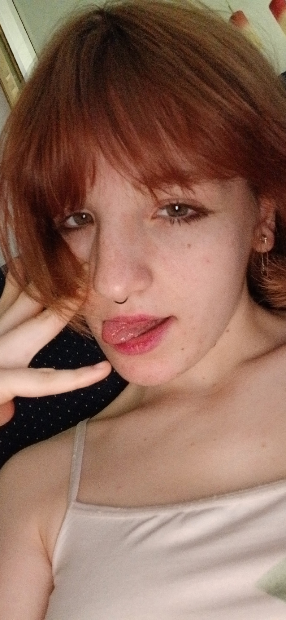 This is a close-up, high-angle portrait of a young person with fair skin, noticeable freckles, and reddish-brown hair. The subject is lying down, their head tilted, looking directly at the camera with…read more