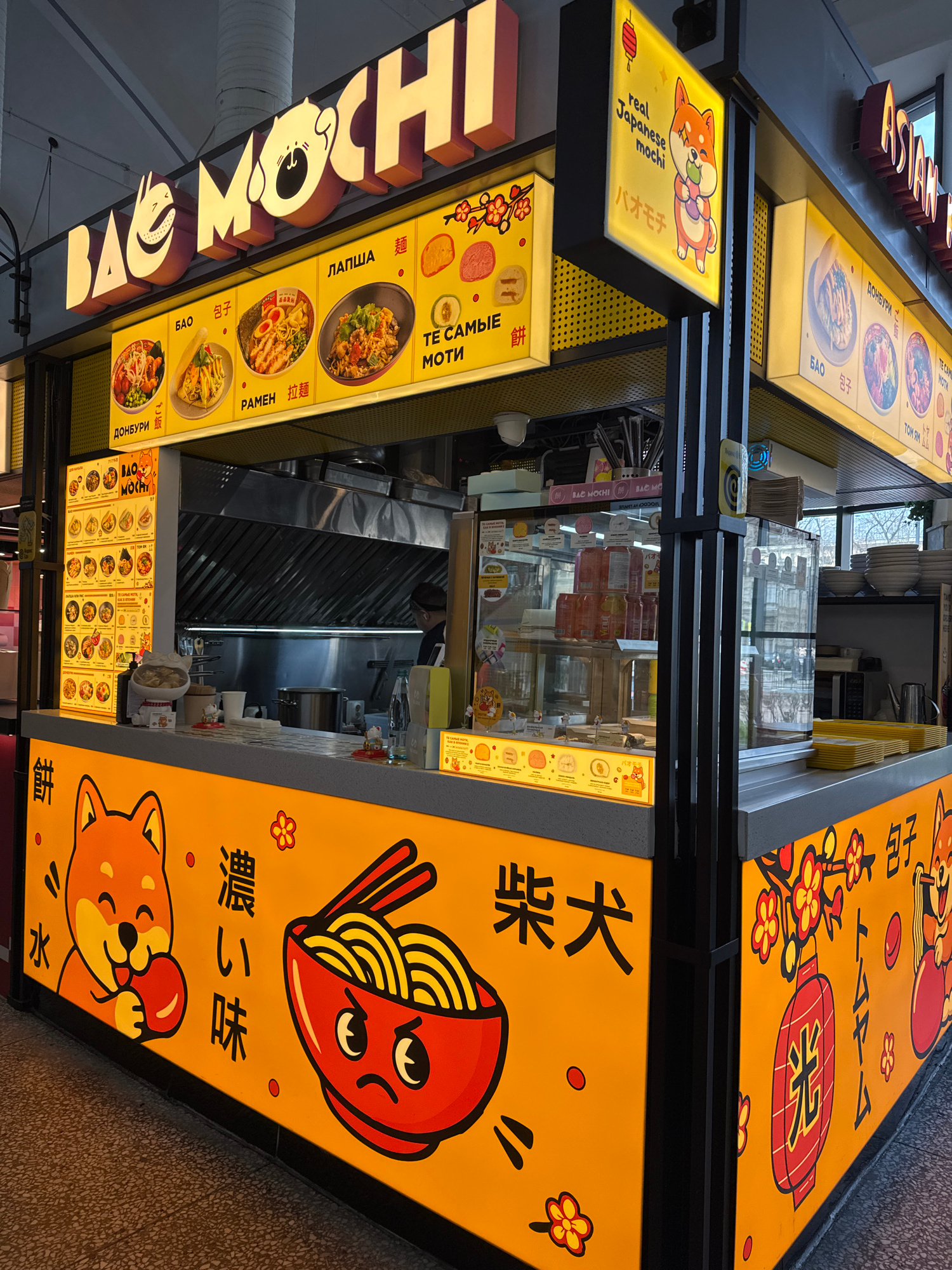 The image shows a food stall in what appears to be a shopping mall in Saint Petersburg, Russia. The stall is brightly lit with signs in both Russian and Japanese or Chinese characters. The name of the…read more