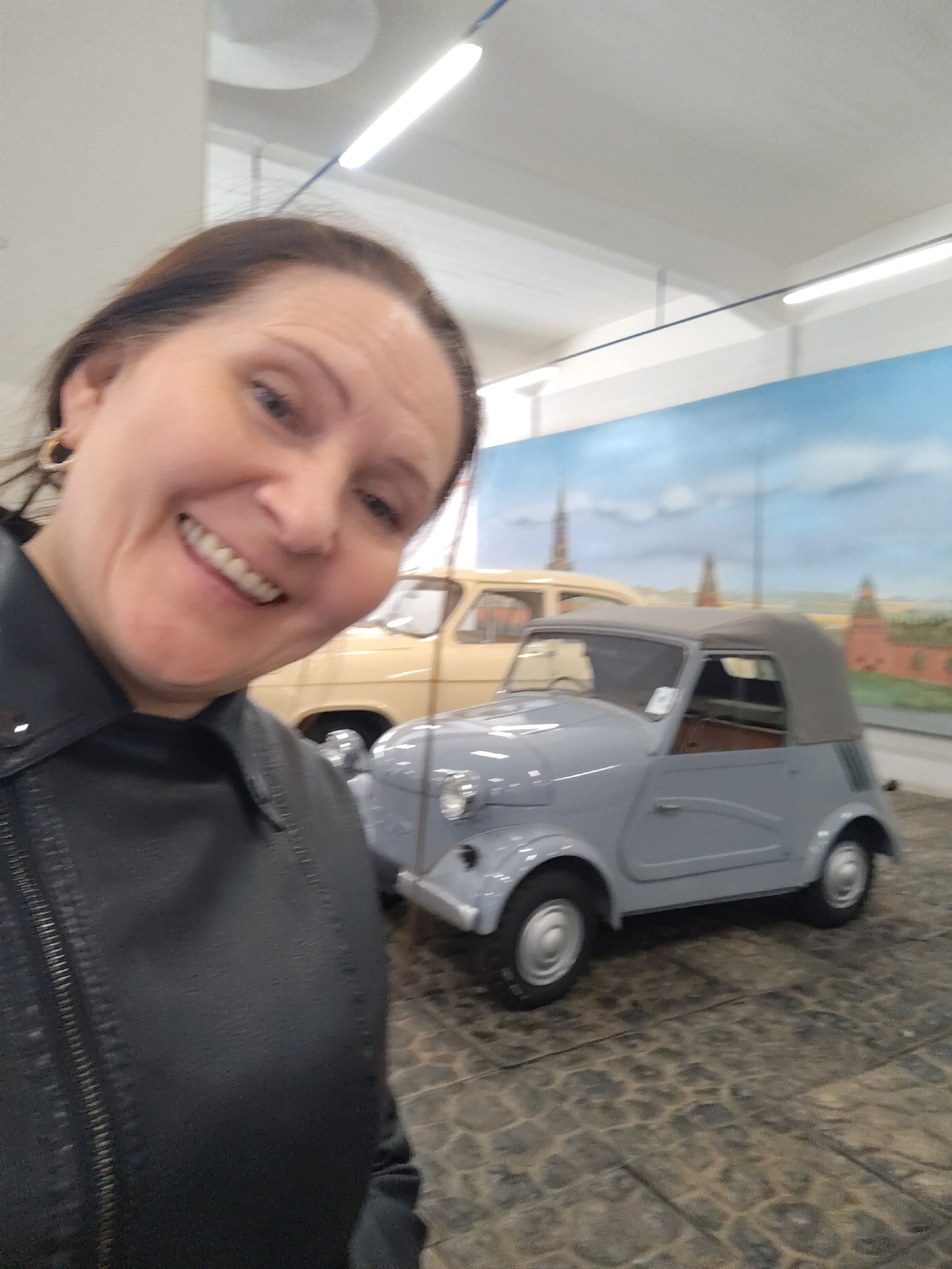 A woman is captured in a selfie in an indoor setting, likely a museum or exhibition hall. She is in the foreground, smiling broadly with her teeth showing, and appears to be happy or amused. She has d…read more