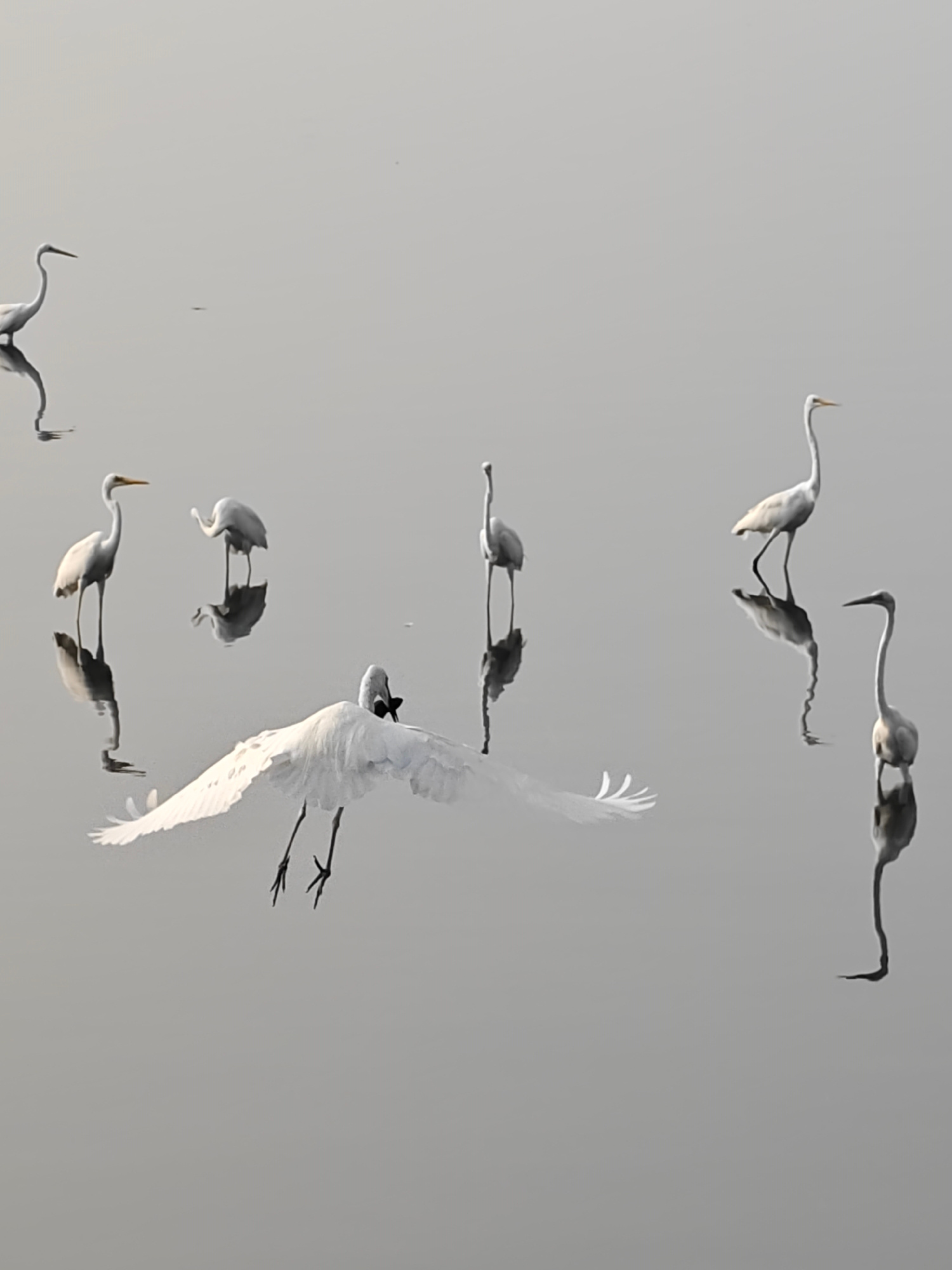 The image shows a group of white birds, likely egrets or herons, in a body of water. Several birds are standing in the water, with their reflections visible. One bird is in mid-flight, with its wings…read more