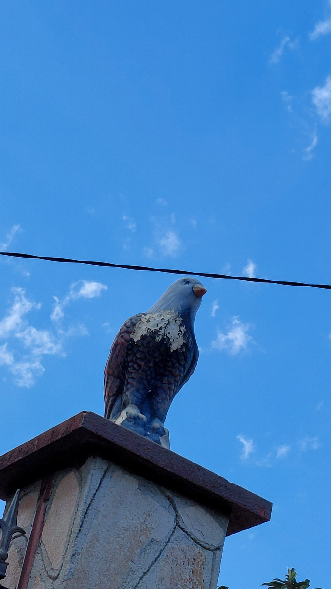 A low-angle shot depicts a ceramic eagle perched atop a weathered structure against a clear blue sky dotted with scattered white clouds. A thin, black electrical wire bisects the upper left quadrant o…read more