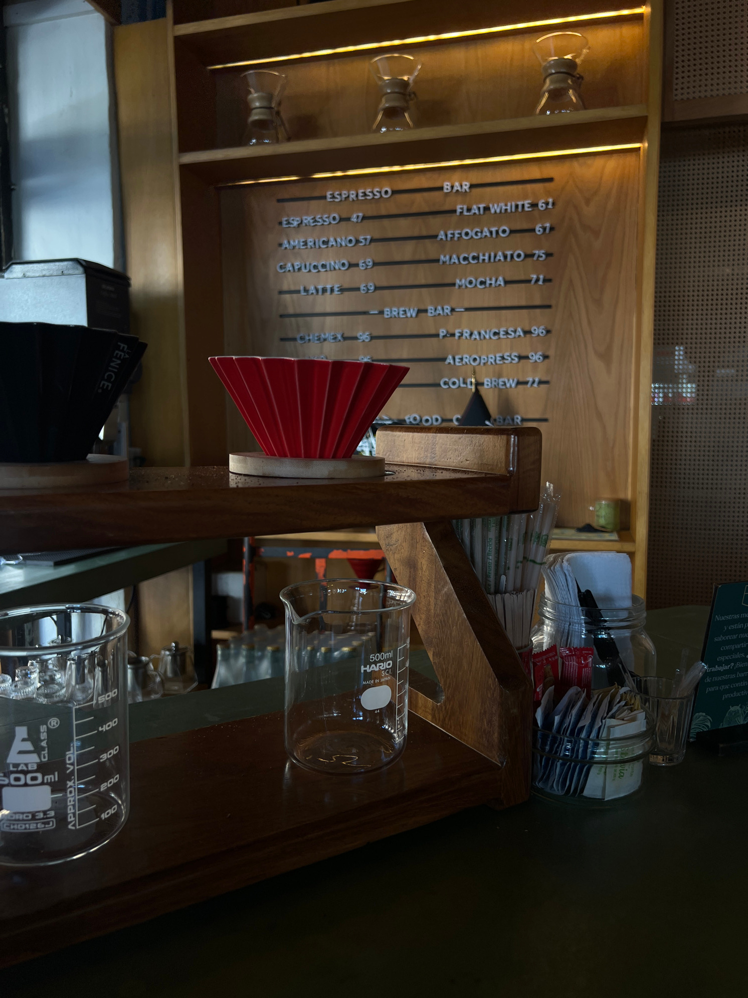 This media file captures an indoor view of a modern coffee bar or cafe counter, likely in Mazatlán, Mexico. The scene is dominated by warm wooden shelving and counter surfaces, illuminated by integrat…read more