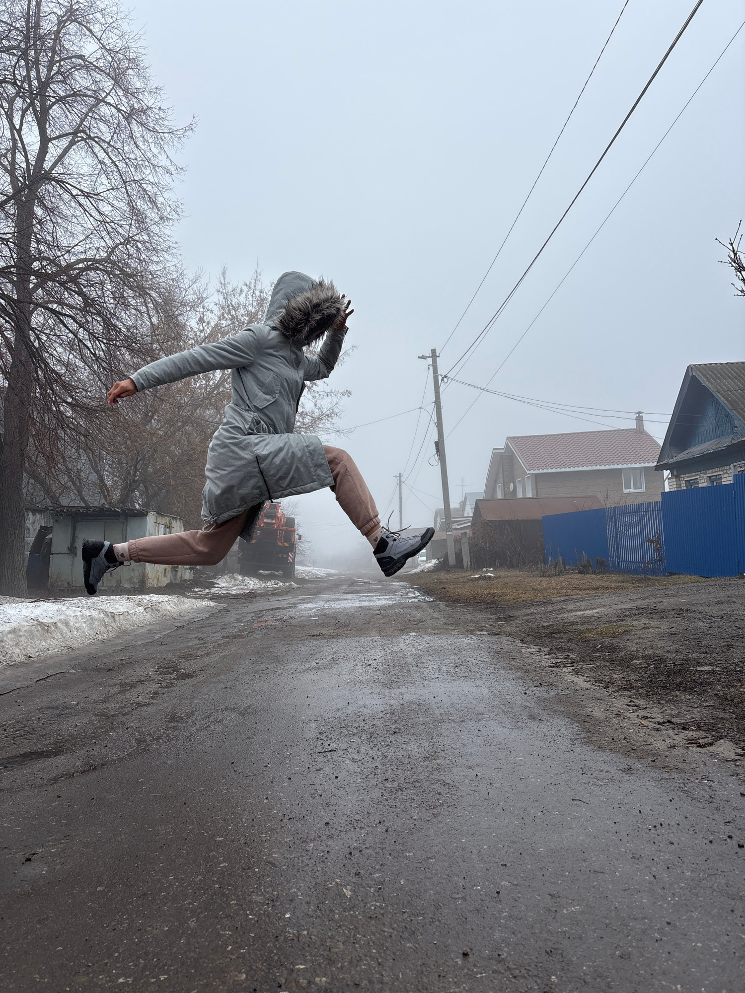 A female figure is suspended mid-air on a street in Ulyanovsk, Russia. She wears a grey hooded jacket, light pink pants, and grey and black boots. The background reveals a street, partially covered in…read more