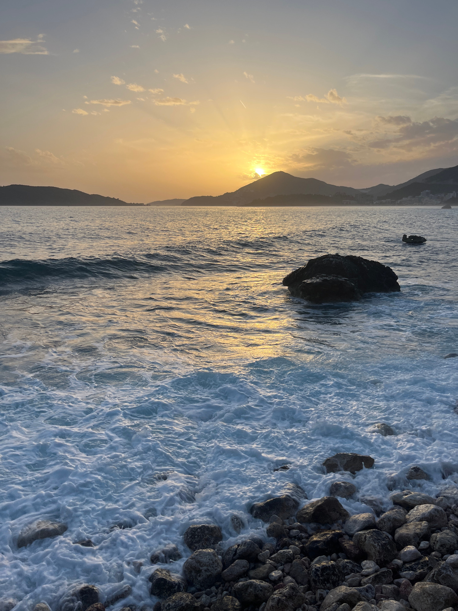 The image captures a sunset view in Kamenovo, Montenegro, depicting the shoreline where the sea meets a rocky beach. The sun, positioned behind a mountain range, casts a bright glow across the sky and…read more