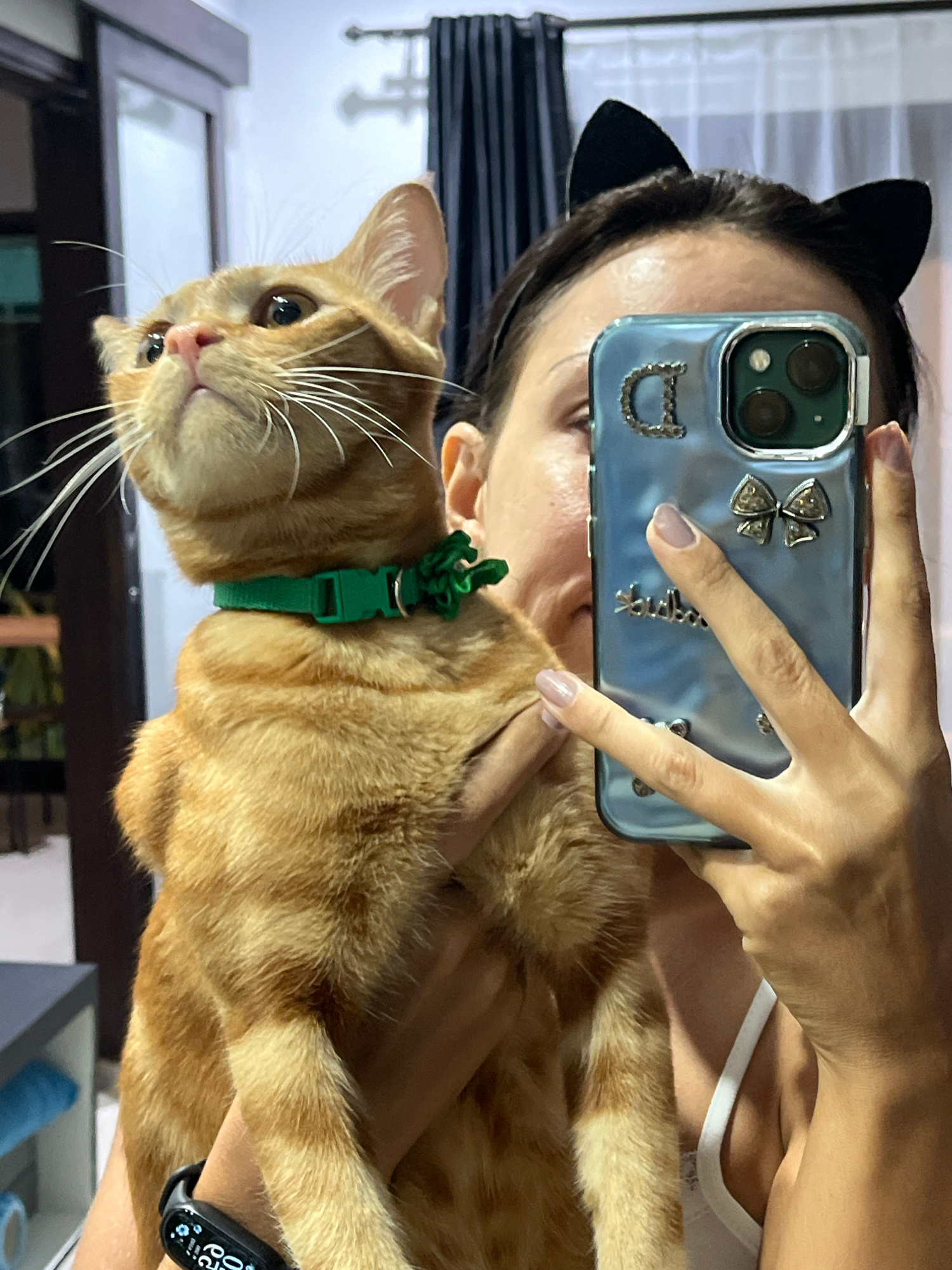 A woman is taking a selfie with an orange tabby cat. She is wearing black cat ears and holding a cell phone with a light blue case decorated with silver accents. The cat is wearing a green collar withβ¦read more