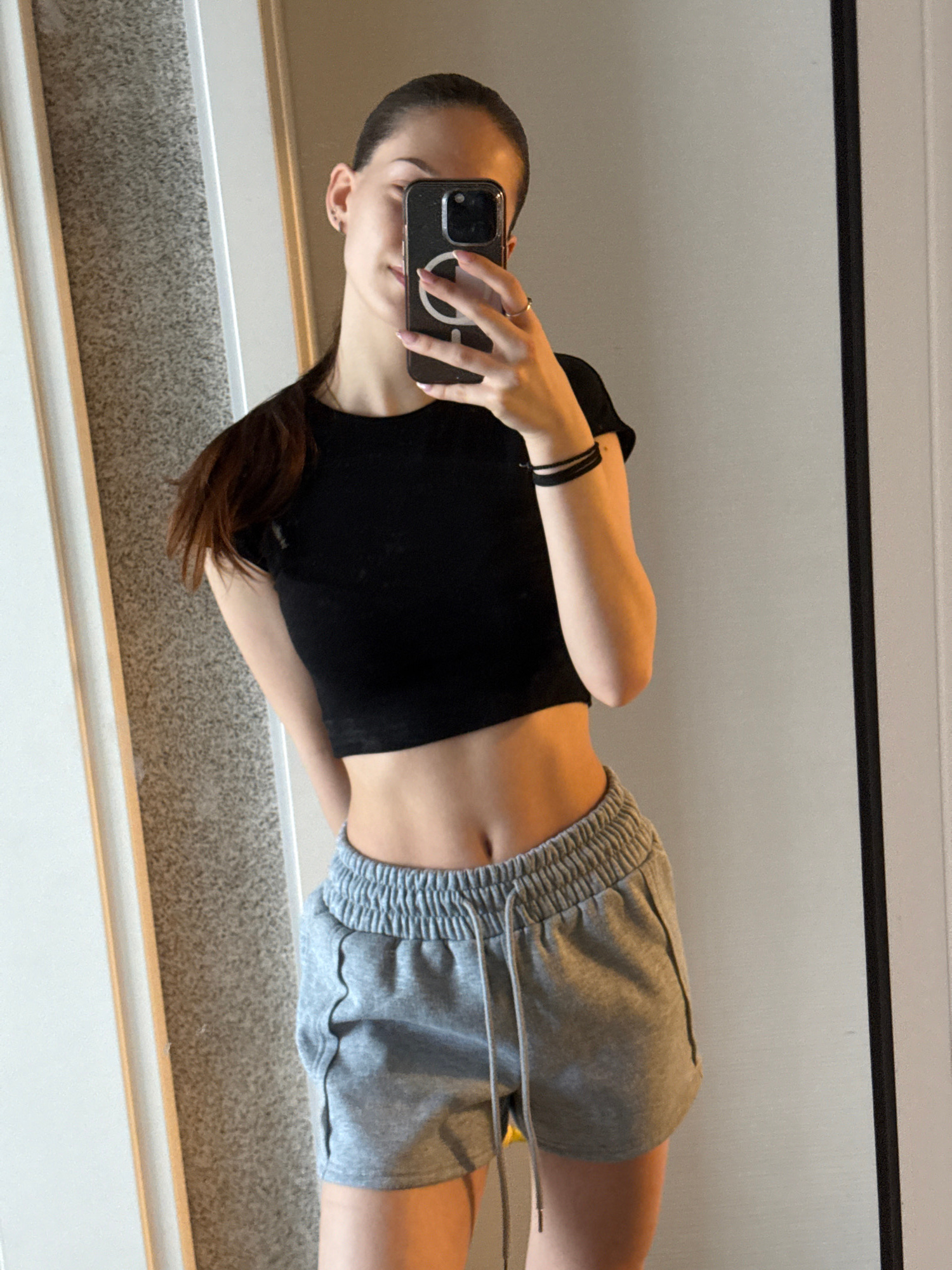 A young woman takes a selfie in a mirror. She is wearing a black crop top and gray sweat shorts. The background shows a bedroom with light carpet and white trim. The location is not discernible to be…read more