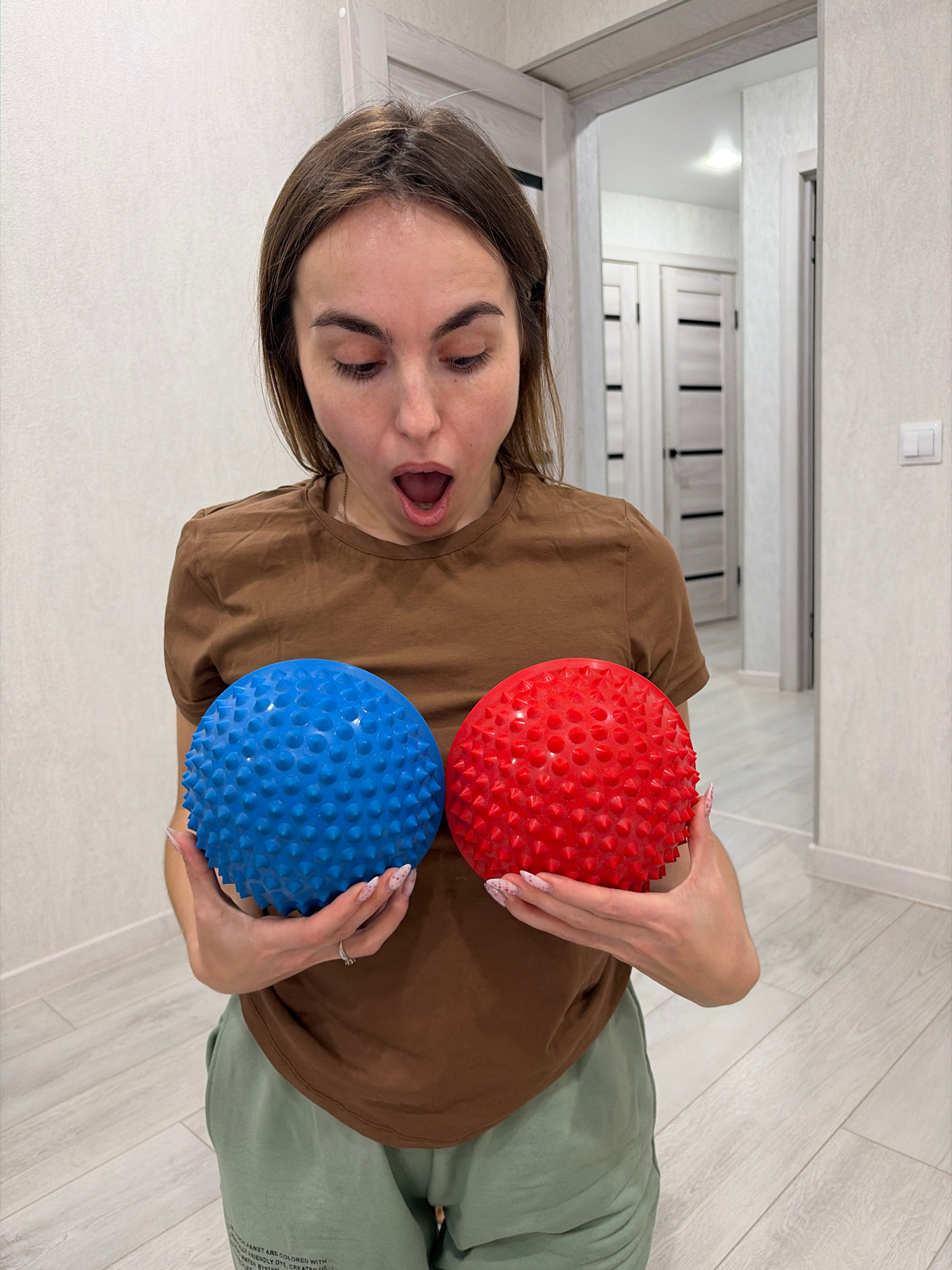 The image depicts a woman indoors, possibly in an apartment or house, holding two spiky massage balls, one red and one blue. She is wearing a brown t-shirt and green pants. Her mouth is open in a surp…read more