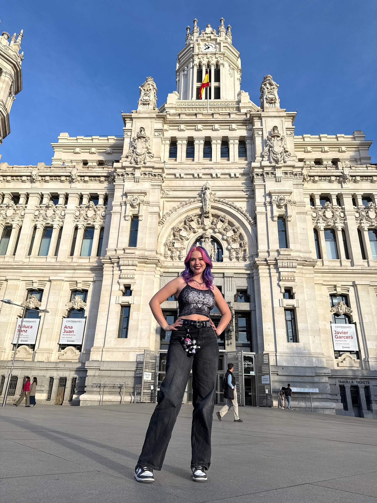 The image is of a smiling woman with purple hair, wearing black pants and a black and gray top, standing in front of a large, ornate, light-colored building. The building has many windows and decorati…read more