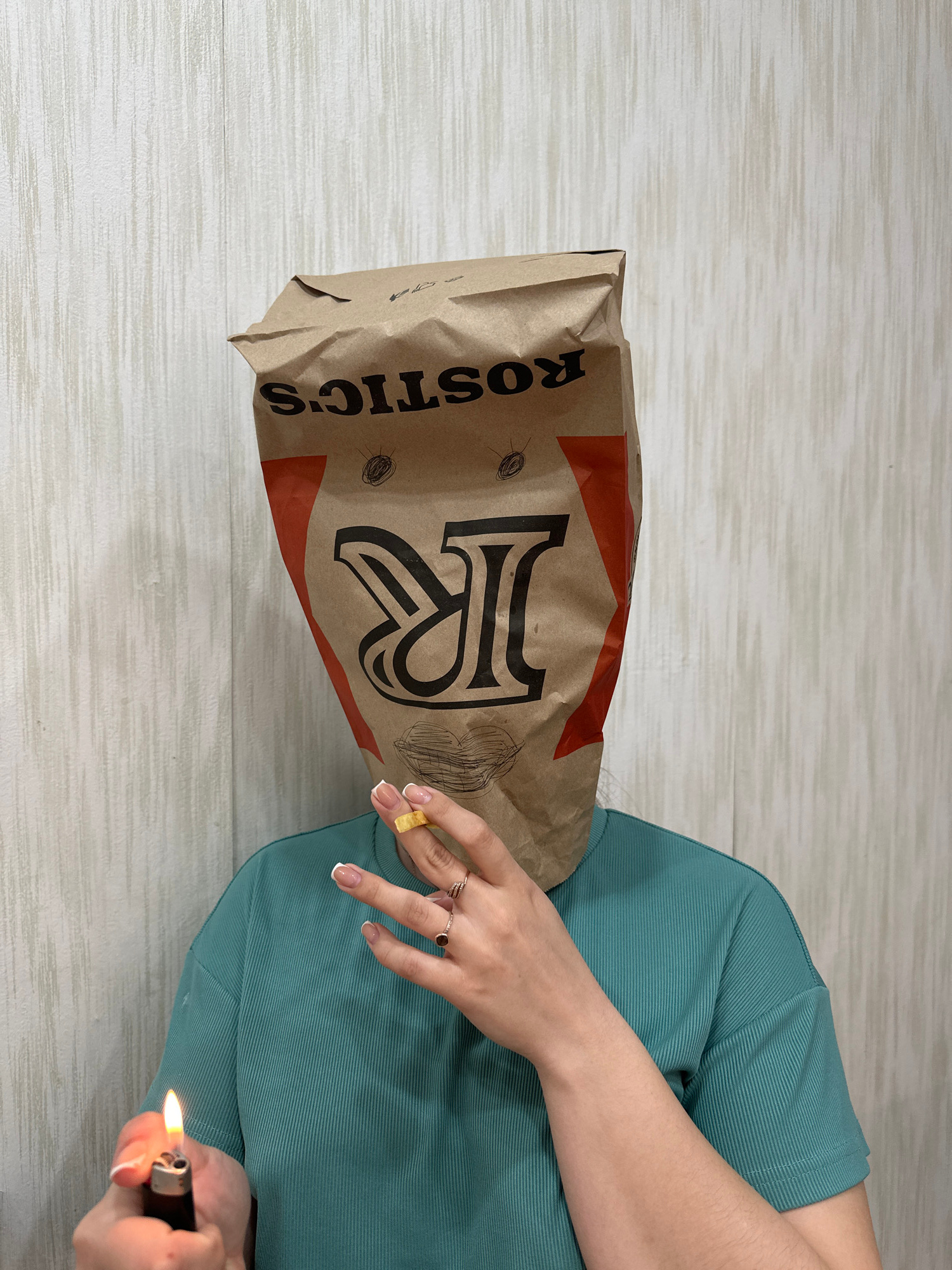 A person sitting indoors on a light-colored, wood-grain surface is holding a lit lighter in their right hand near a brown paper bag labeled "ROSTIC'S" with a large "R" on it. The bag appears to be upr…read more