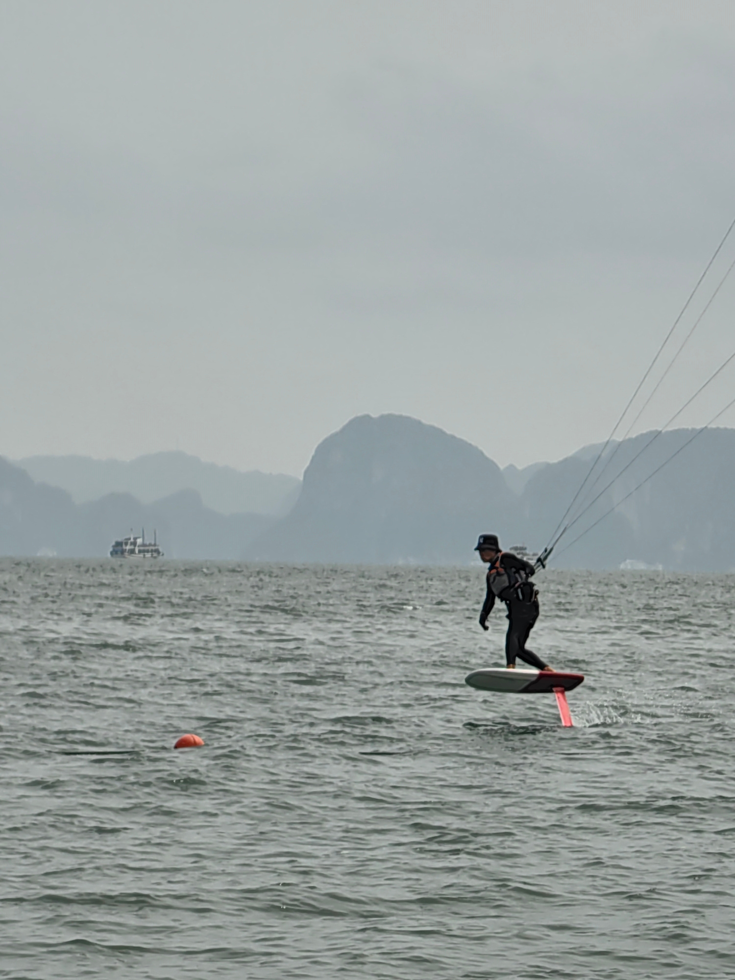 A person is kitesurfing on the water in Bai Chay Ward, Vietnam. The individual is wearing a black wetsuit, life vest, and a hat. They are standing on a foilboard, with a red hydrofoil wing visible ben…read more