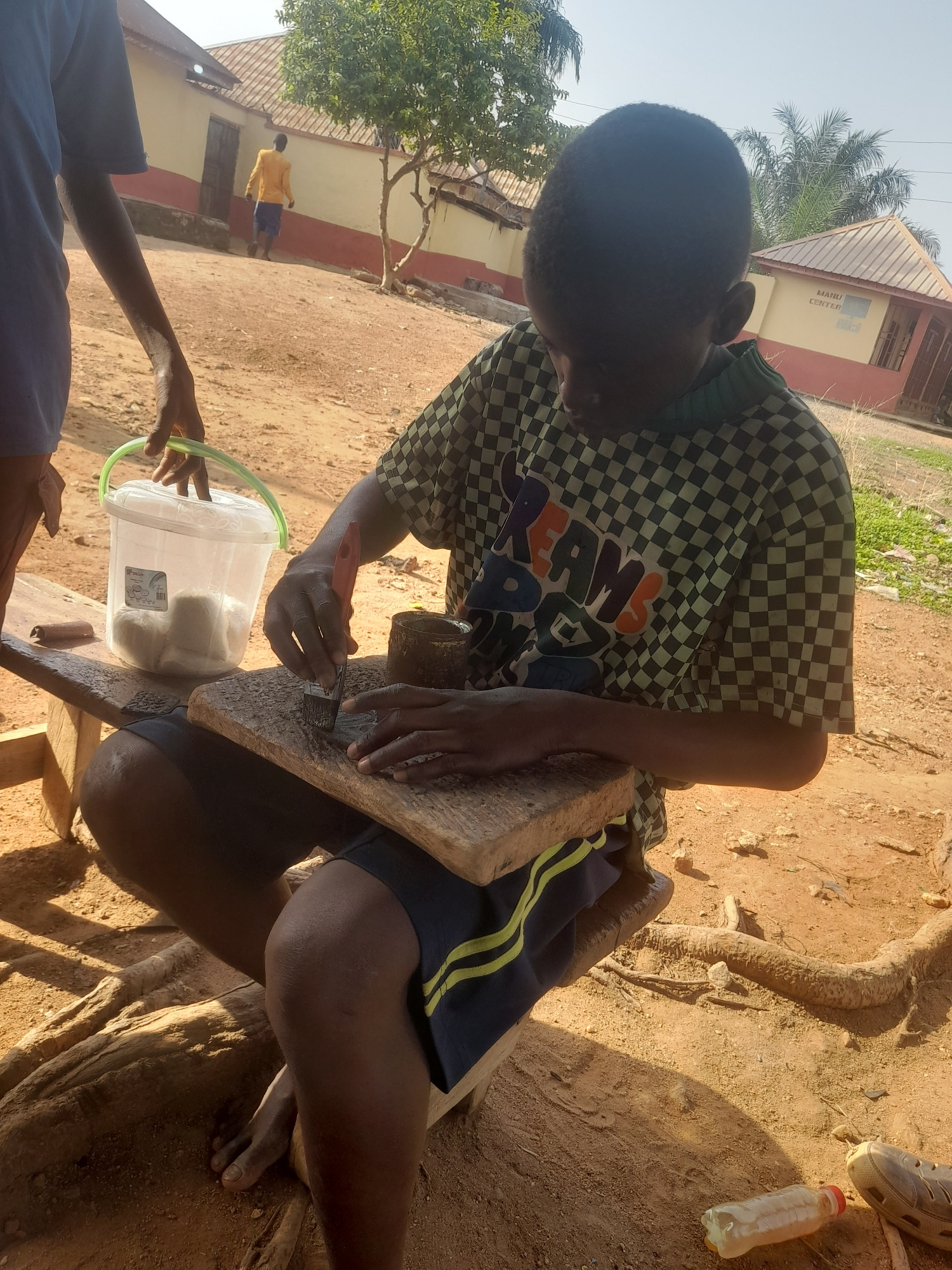 The image shows a person sitting on a wooden stool in an outdoor environment, potentially in Akwanga, Nigeria. The individual is wearing a checkered shirt and shorts with yellow stripes. They are hold…read more