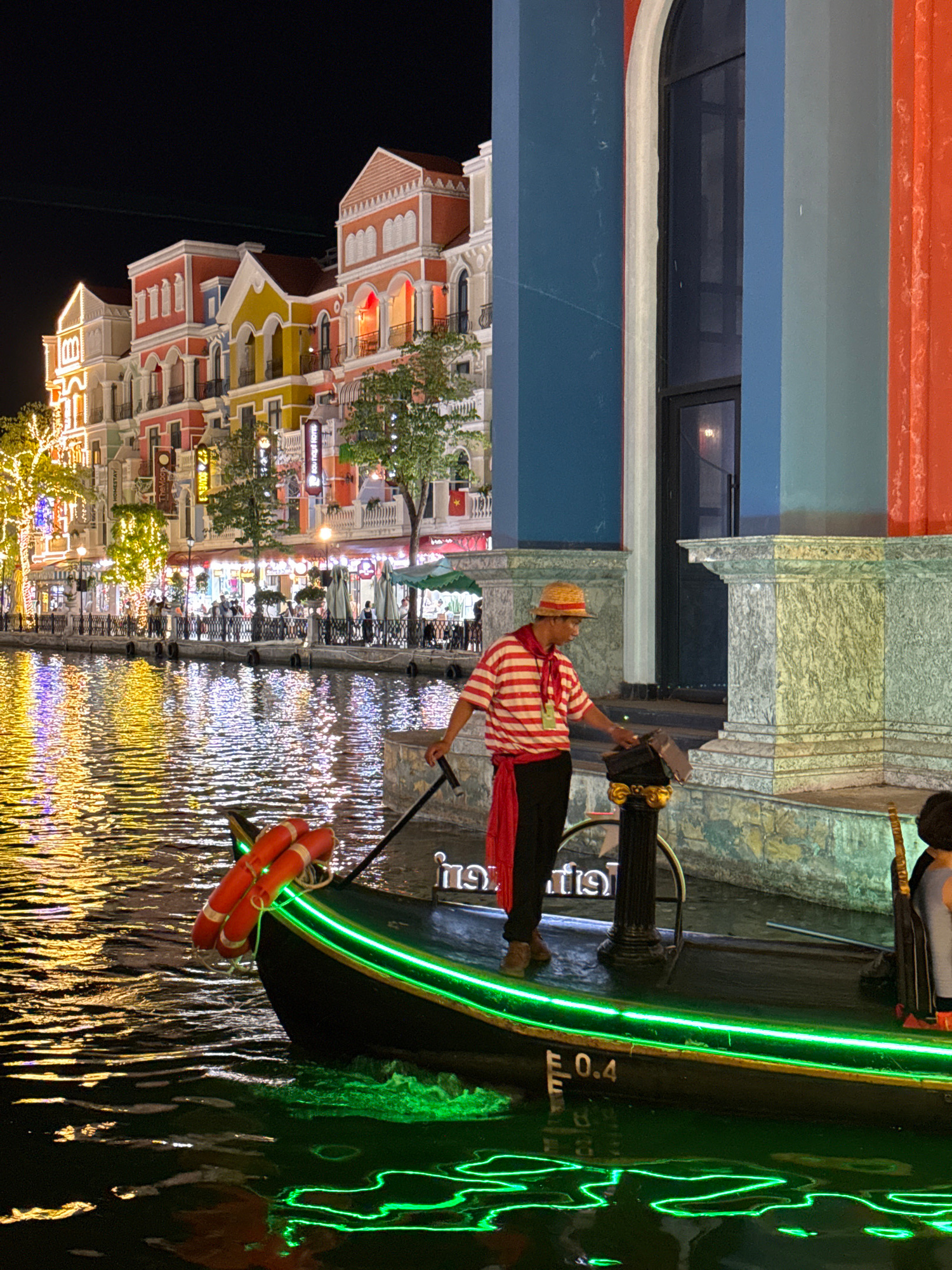 The image displays a vibrant night scene along a canal, likely a themed attraction resembling Venice, located in Phú Quốc, Vietnam. A person, dressed as a gondolier in a red and white striped shirt, r…read more