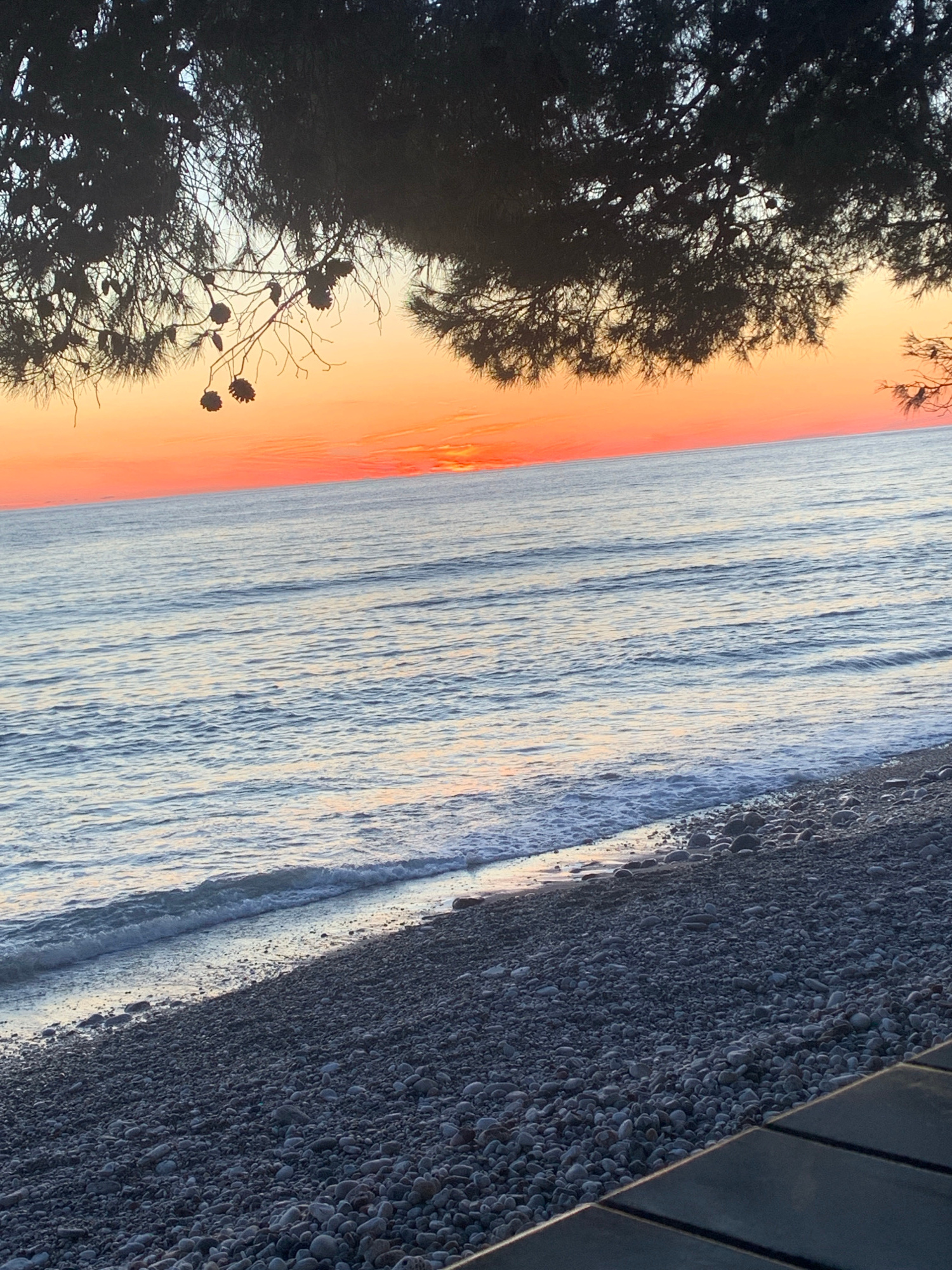 The image depicts a sunset view from a beach in Bar, Montenegro. On the left, the silhouettes of trees are prominent against the orange and pink sky. Adjacent to the sky is a body of water, likely the…read more