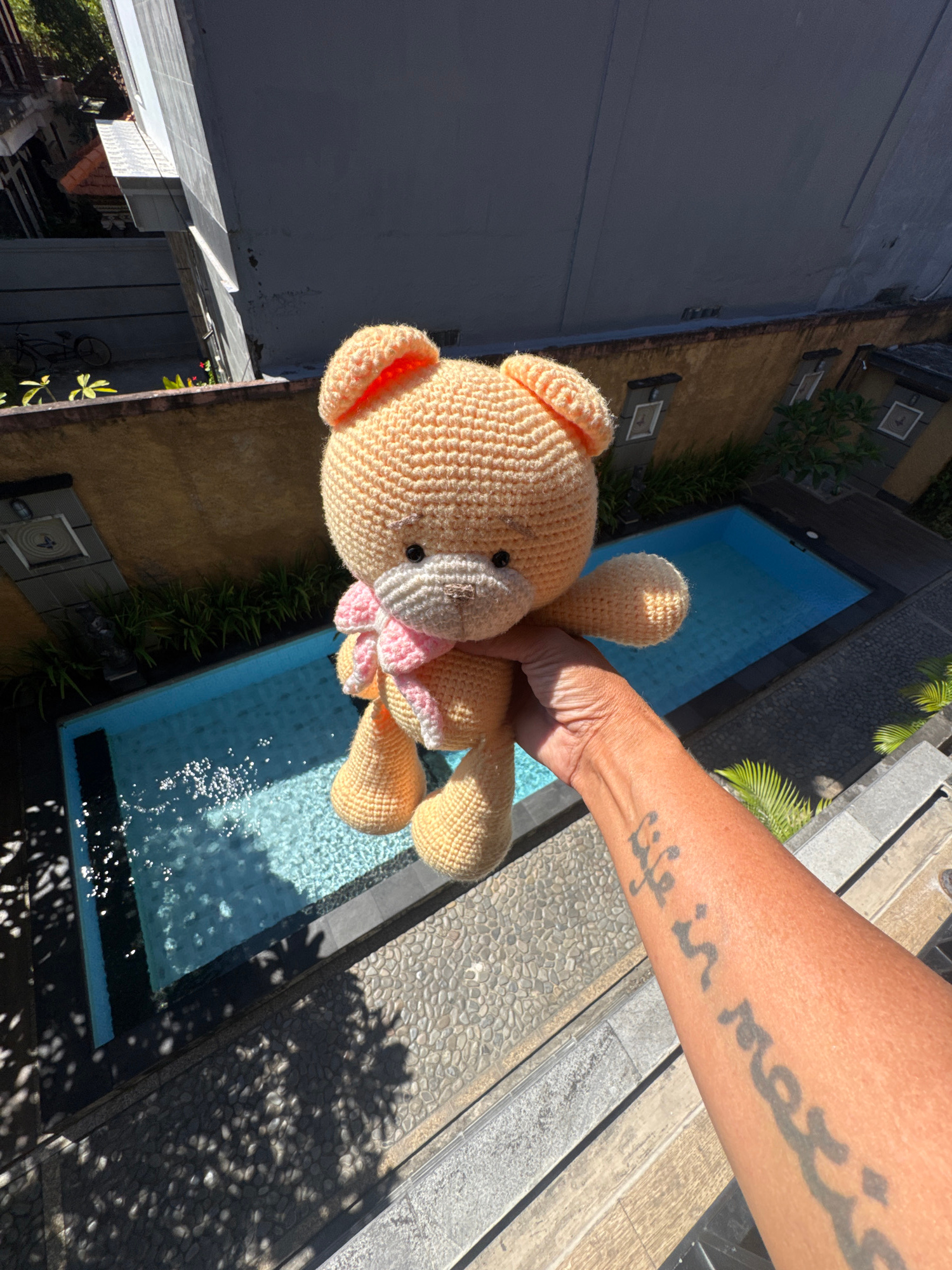 A person is holding a crocheted bear near a swimming pool in what appears to be Kuta, Indonesia, based on the architectural style and vegetation. The pool is rectangular and filled with water. A tattoβ¦read more