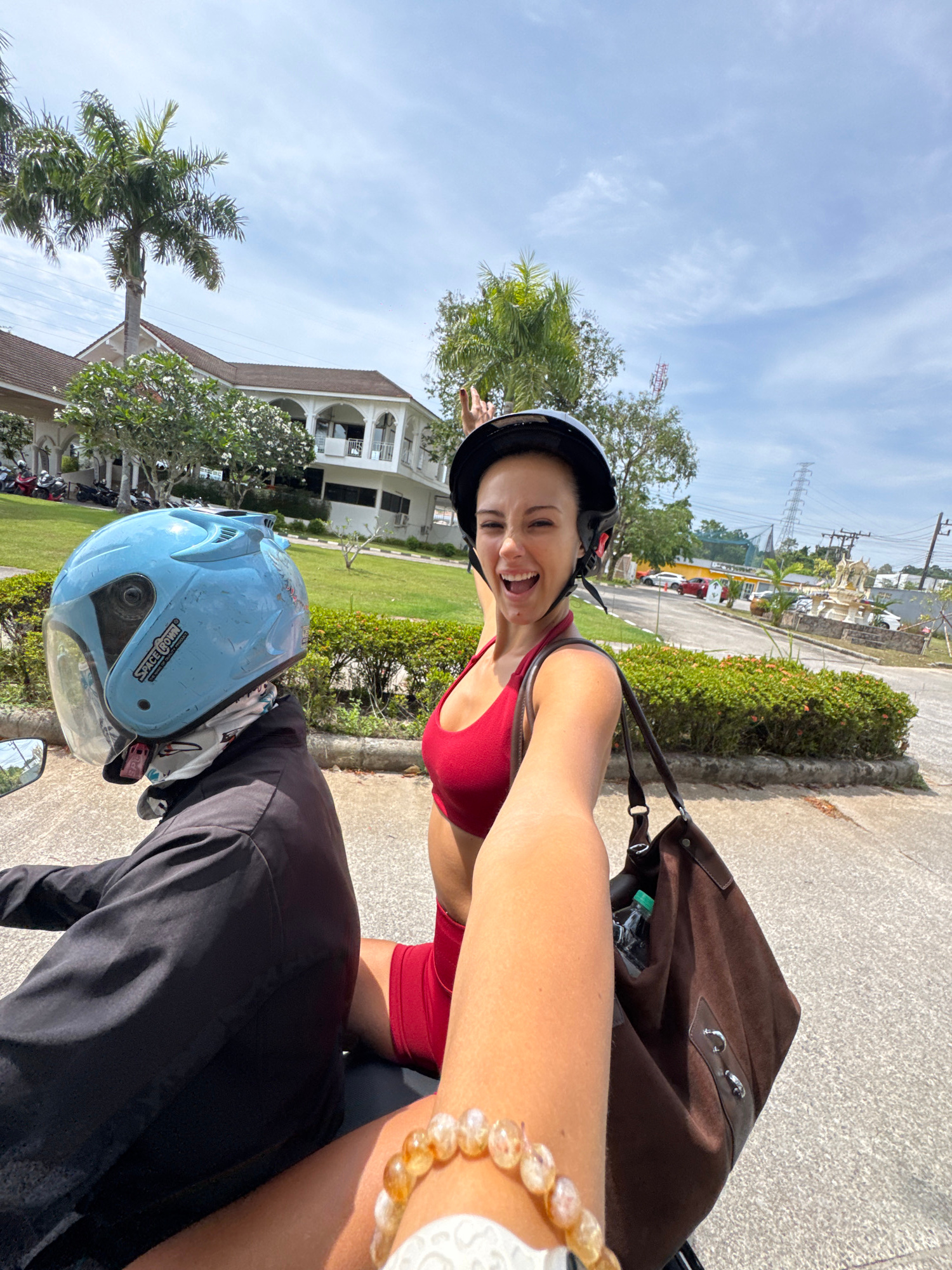 A woman in a red top and black helmet is taking a selfie while riding a motorcycle in Kathu, Thailand. She is grinning and holding up her hand. The driver of the motorcycle is wearing a blue helmet an…read more