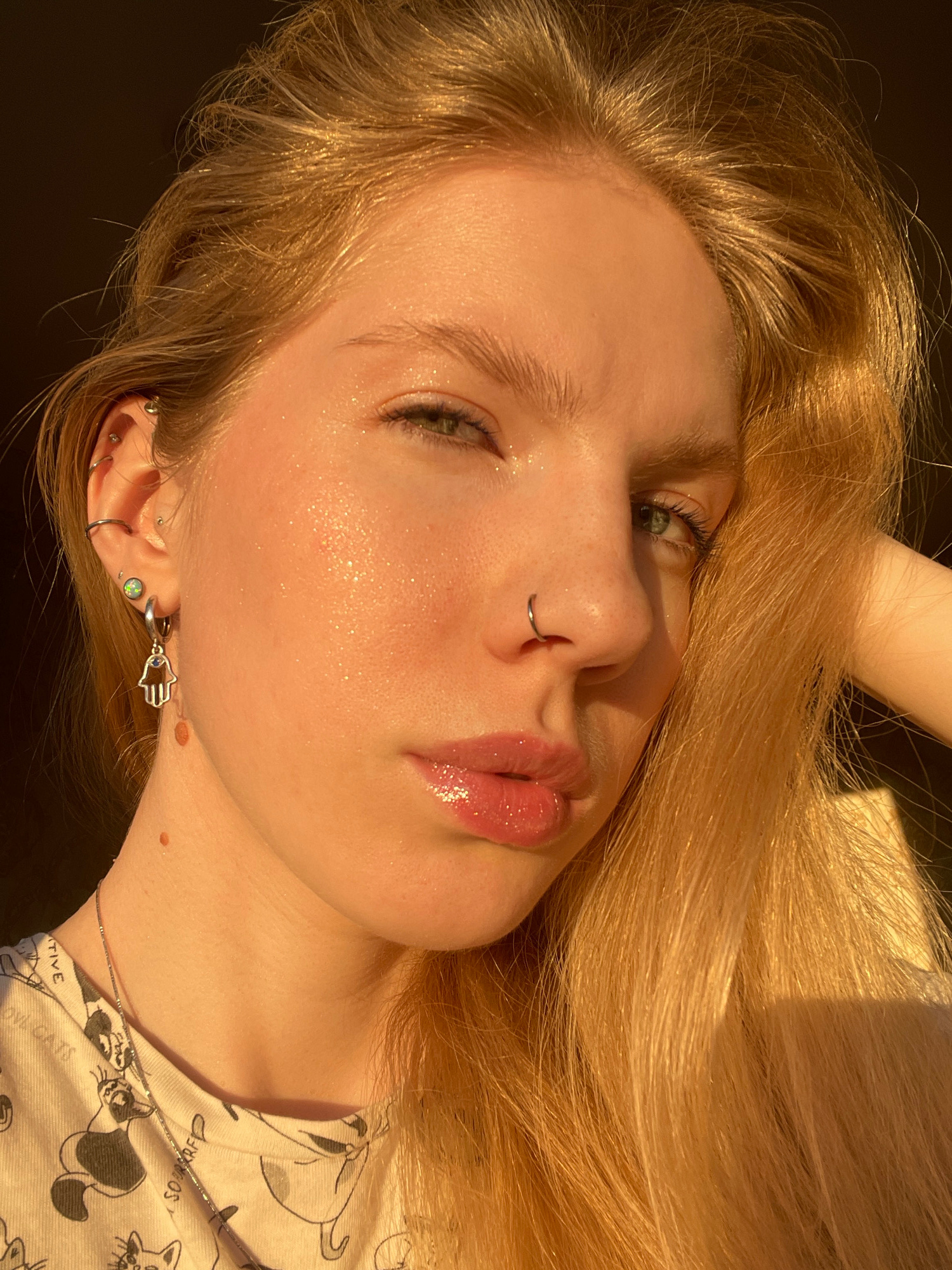 A close-up portrait depicts a young woman with long, blonde hair and fair skin. Her face is angled, revealing her facial features in detail. She has green eyes, a nose ring, and glossy lips. Light is…read more