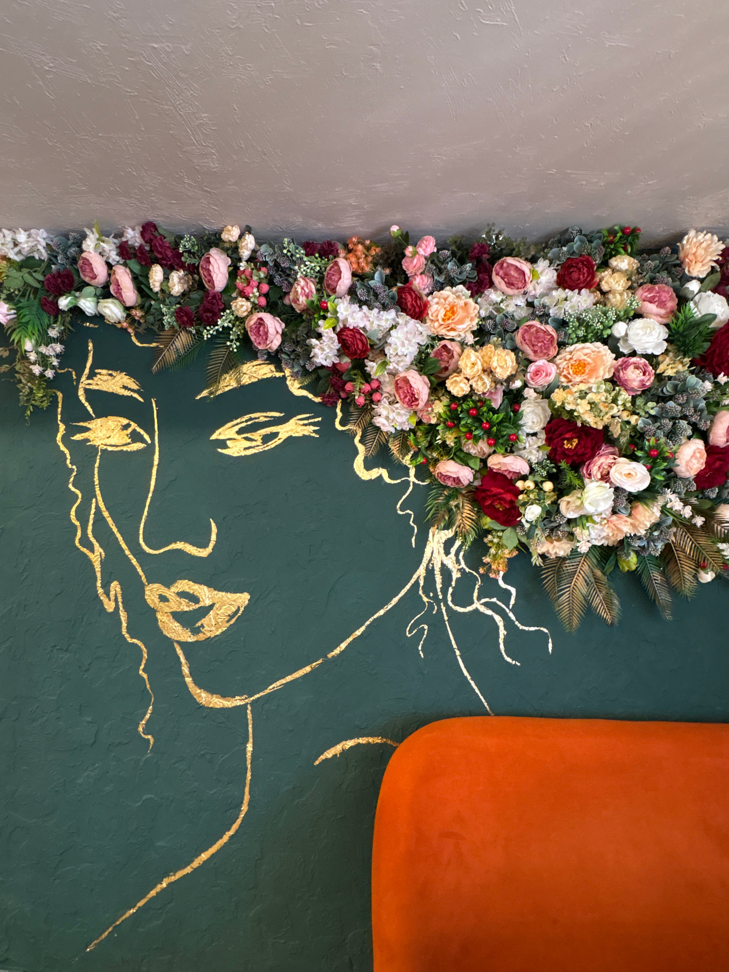 The image shows a wall in what appears to be an interior setting, possibly a restaurant or cafe. A vertical floral arrangement primarily of roses and foliage borders the left edge of the wall. The wal…read more