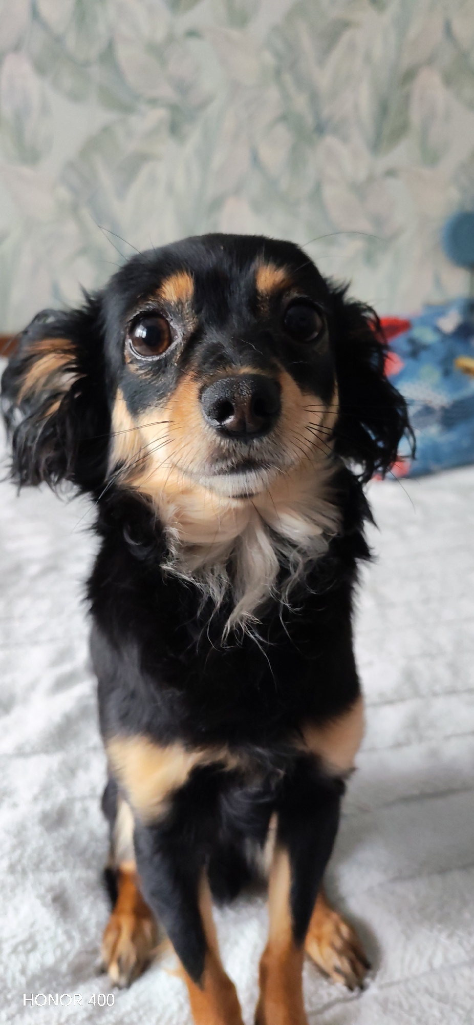 A medium shot captures a small, black and tan dog looking directly at the camera. The dog is primarily black with tan markings on its face, chest, and legs. It has a long coat with slightly wavy hair…read more