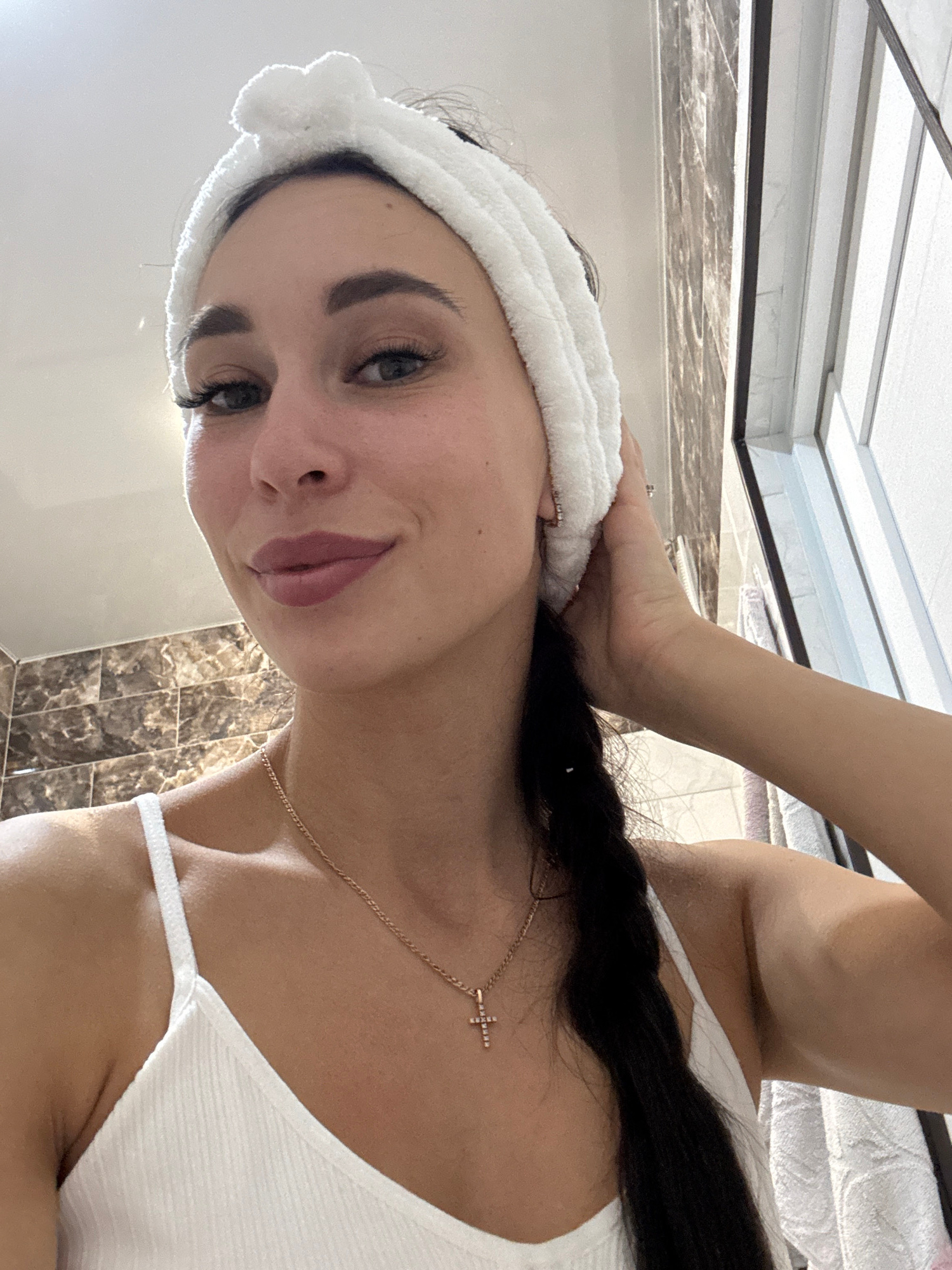A young woman poses for a selfie in what appears to be a bathroom. She is wearing a white headband and a white tank top, and a thin gold necklace with a cross pendant. Her dark hair is braided. The ba…read more