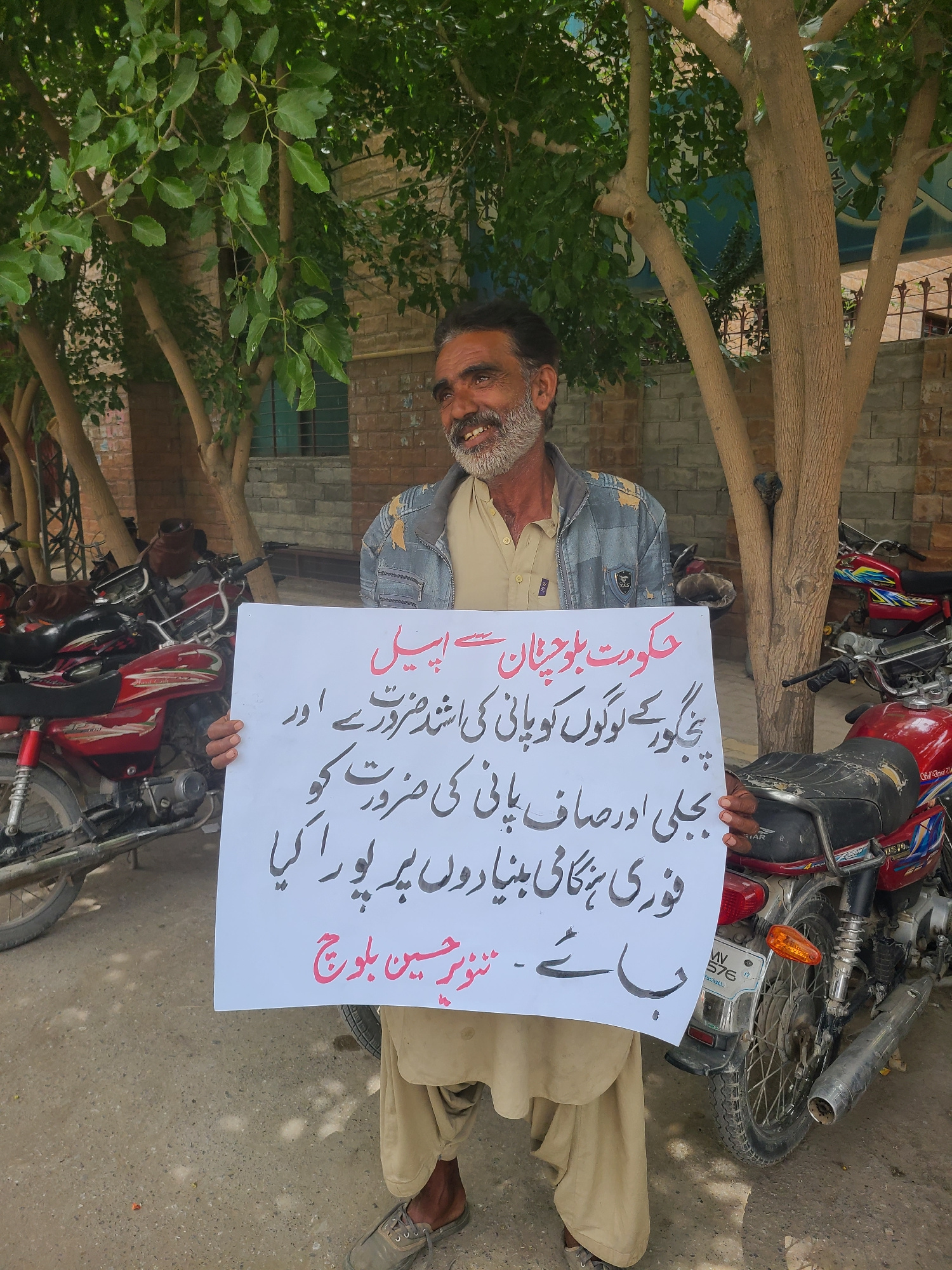 A man stands outside, holding a sign written in Urdu. The sign calls on the government of Balochistan to provide clean water and electricity to the people of Panjgur. Behind the man, there are several…read more