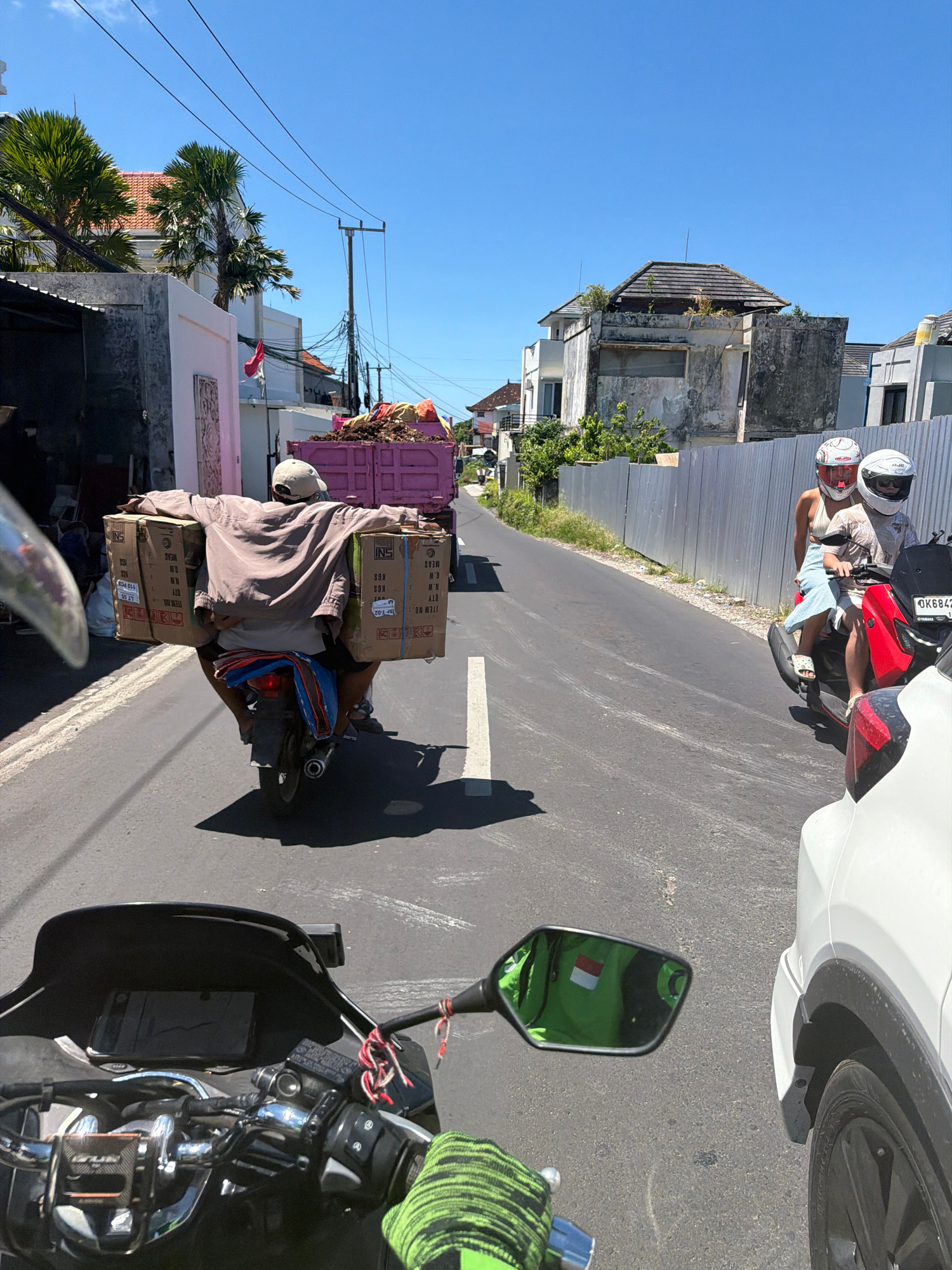 The image shows a street scene with various subjects and objects. In the foreground, parts of a motorcycle, including the mirror, handlebars, and gauge cluster, are visible, suggesting the image was t…read more