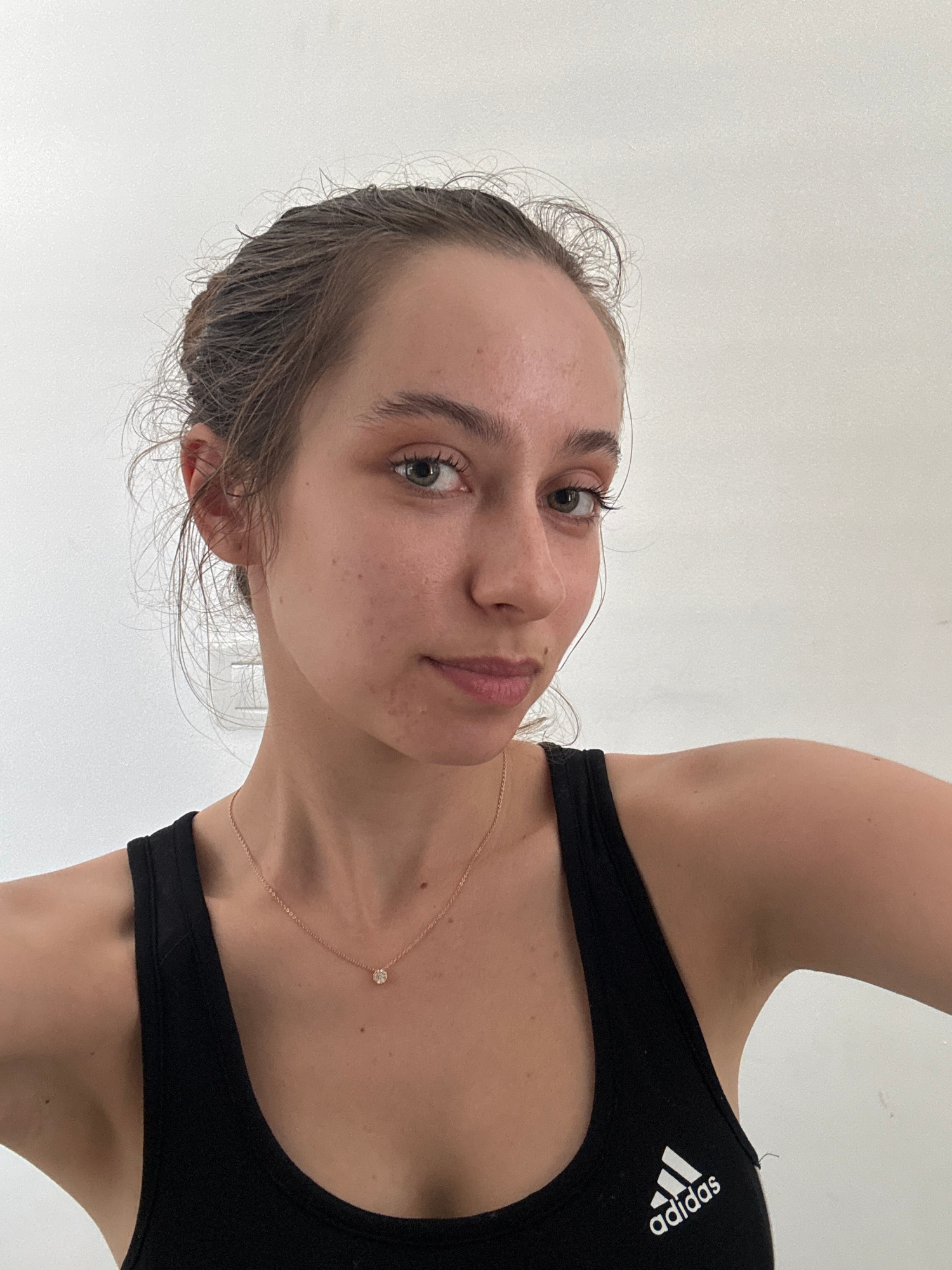 A close-up, vertically oriented portrait features a young woman with light skin, light brown hair, and green eyes, looking directly at the viewer. Her hair appears damp or styled with a wet look, pull…read more