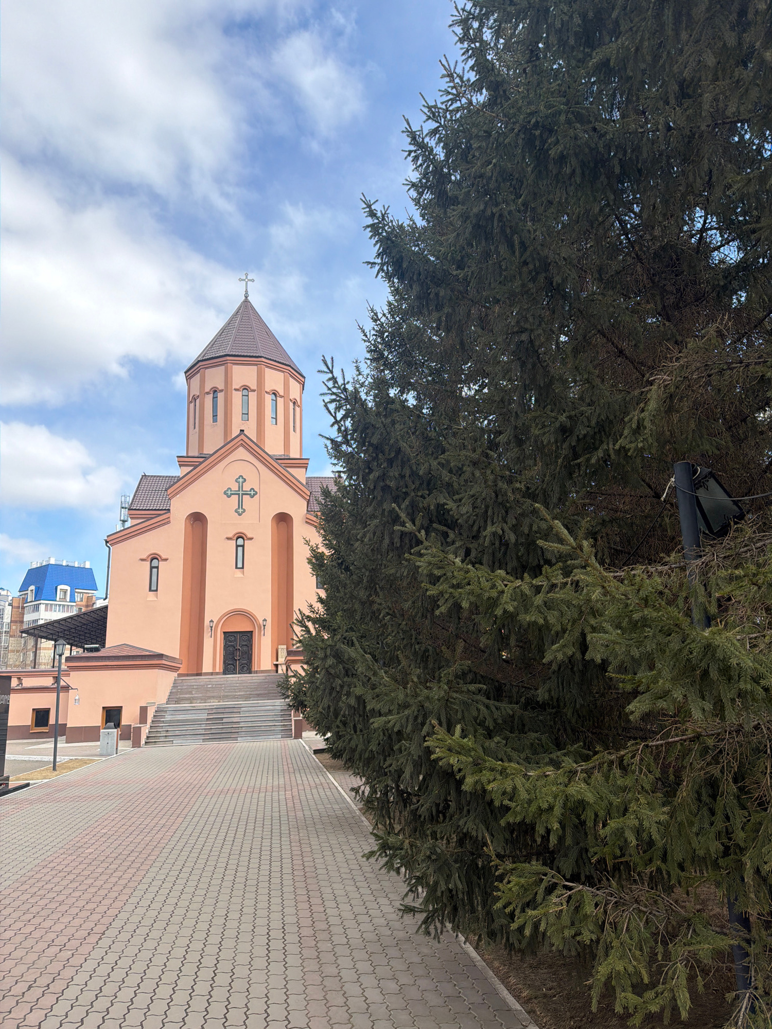 This image depicts a peach-colored religious building, likely a church, situated under a partly cloudy sky. The building features a distinctive architectural style with an octagonal tower topped by a…read more