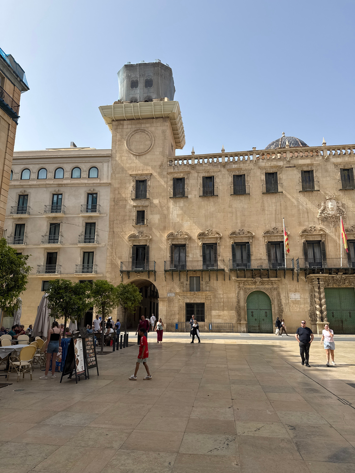 The image shows a building in Alicante, Spain. The building is a light brown color with multiple windows and balconies. There are Spanish flags hanging from the building. There is a tower on the leftβ¦read more
