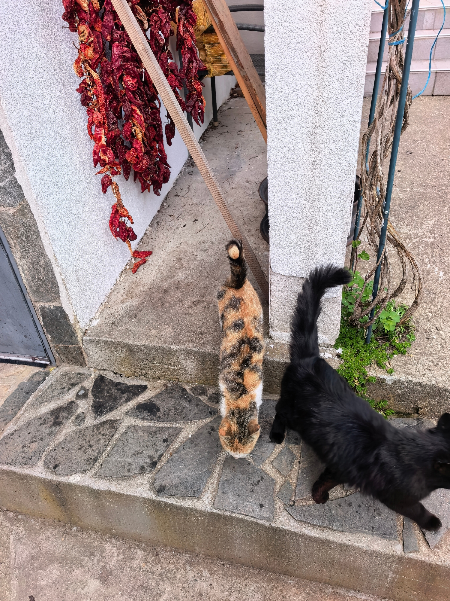 On a paved area outside a building in Unknown, Unknown, two cats are present. One cat is calico and white and is standing with its head down. A second cat is black and is walking towards the right sid…read more