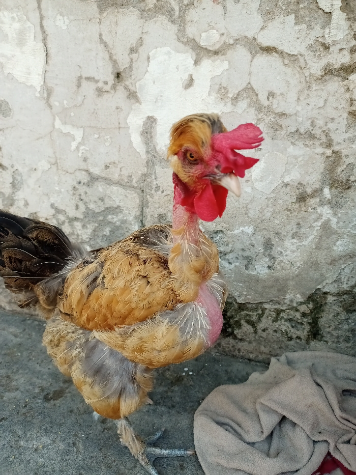A domestic fowl, possibly a chicken, stands in front of a cracked wall. The bird has a golden-brown body with a mix of dark brown and black feathers on its back. Its neck is bare and red, and it has a…read more