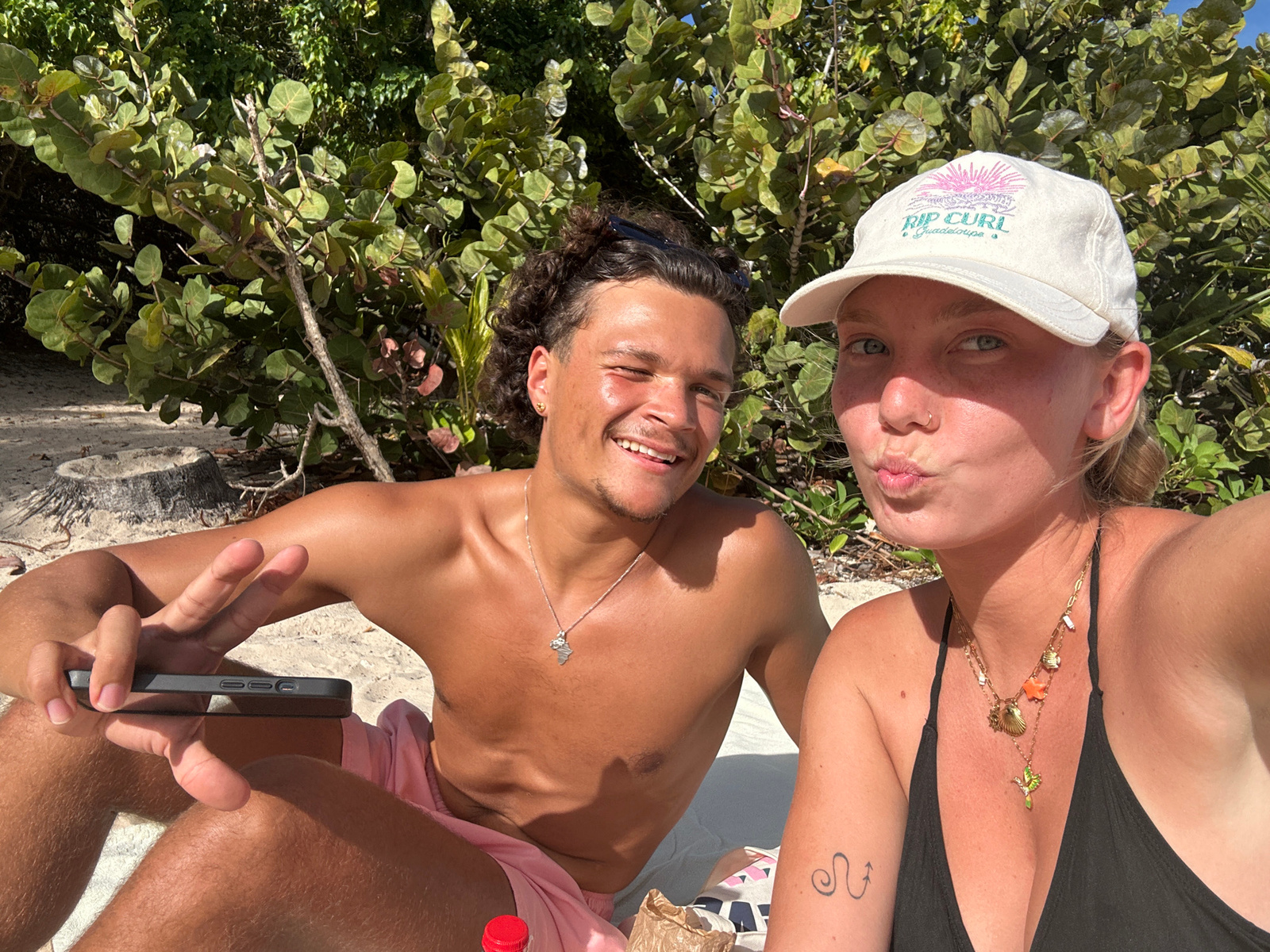 Two individuals, a man and a woman, are photographed in what appears to be a selfie. The man is shirtless with dark curly hair, wearing sunglasses on top of his head and a necklace. He is holding a da…read more
