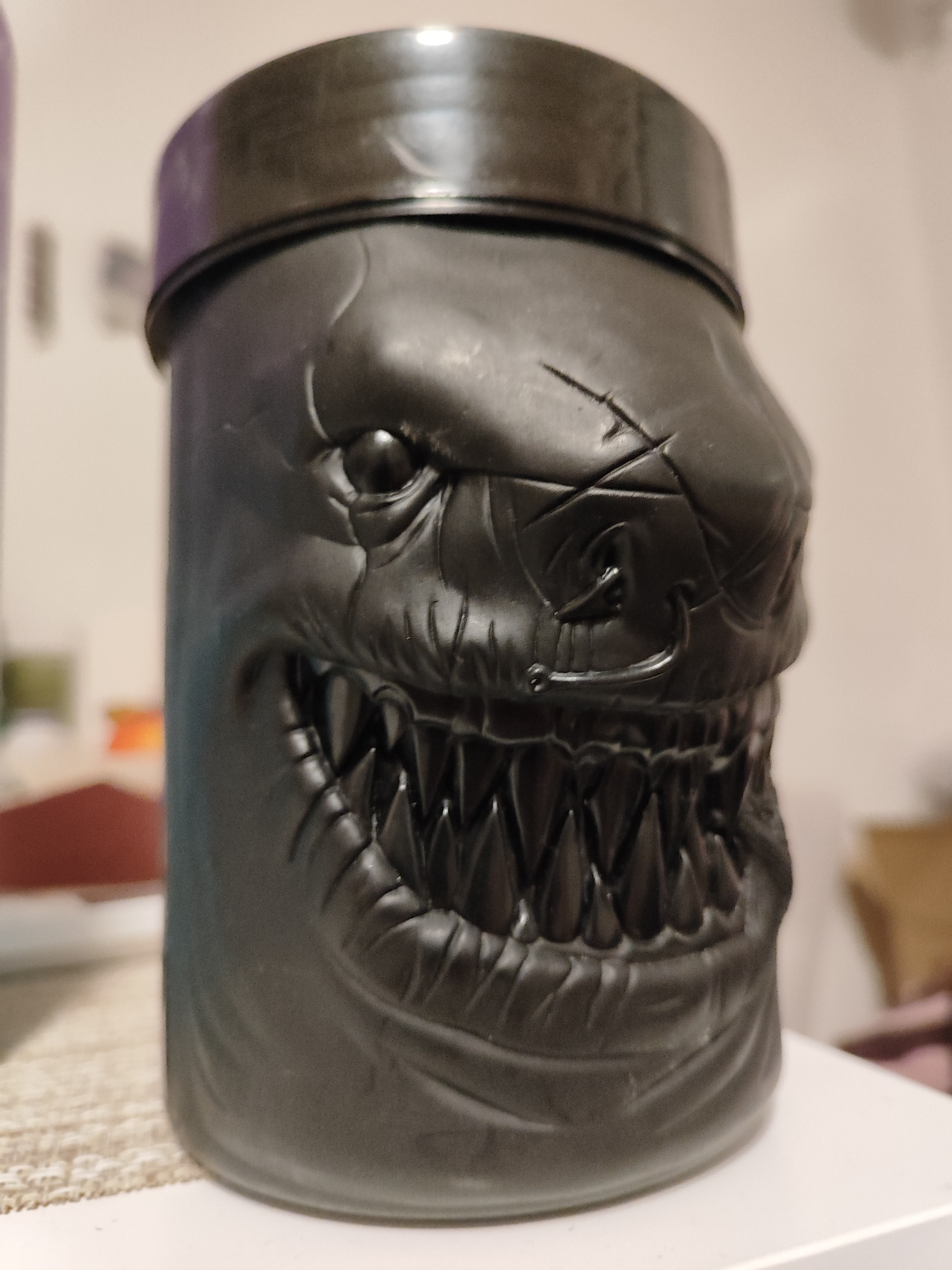 The media file displays a dark, intricately designed container, likely a supplement tub or shaker bottle, shaped like a menacing shark's head. The container is predominantly matte black, with subtle b…read more