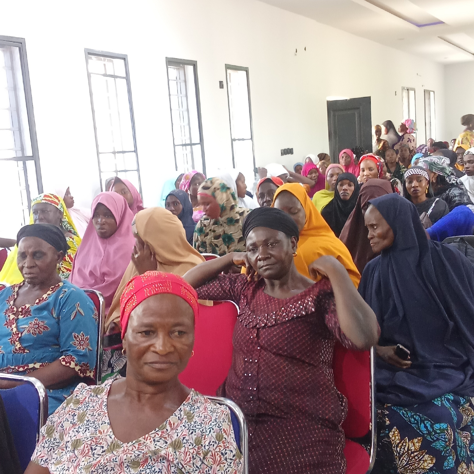 The image captures an indoor gathering of approximately 50 to 70 adult women in Akwanga, Nigeria. The setting is a spacious, well-lit room with white walls and a white ceiling featuring a modern reces…read more